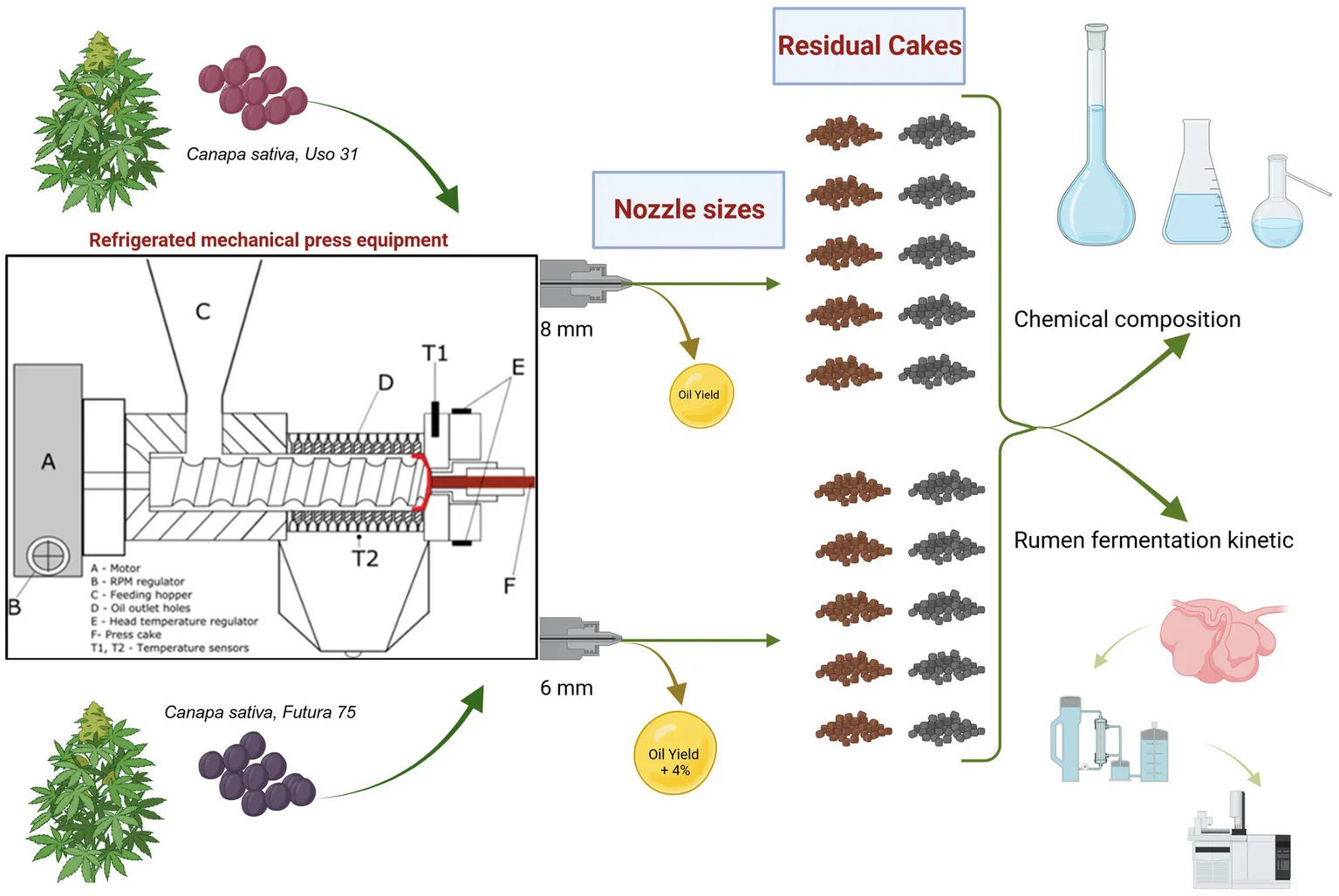 Sporadic reports have investigated the effect of nozzle size on hemp oil yield and quality (10, 17–19), but none of them addressed the issue of extraction temperature and of the residual cake quality. Therefore, this study analyzed the use of two nozzle diameters in a cold extraction process (50°C) (i) on the pressing efficiency (ii) on the chemical composition and in vitro fermentation characteristics of hemp cake. The oil properties will be the subject of a further report.