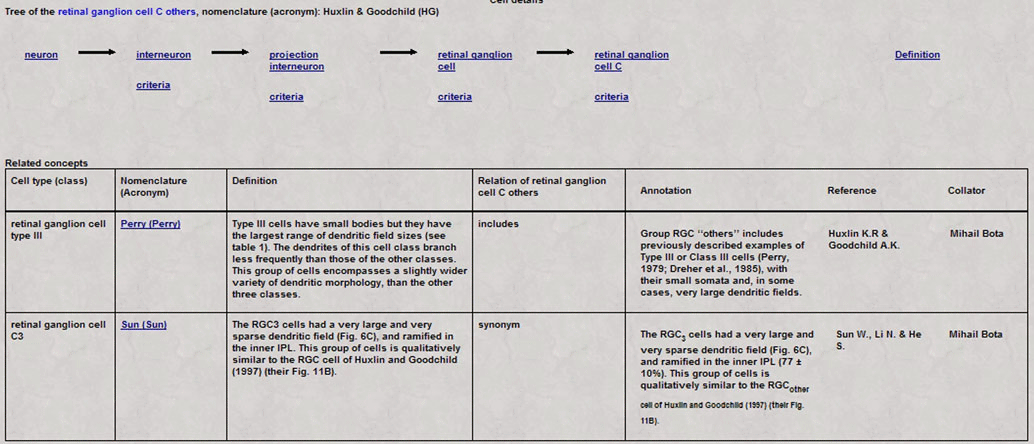 Figure 6. Information that can be retrieved in BAMS and is related to neuron concepts include related terms, their semantic relations, annotations, references and collators, as well as the set of parents with links to the associated classification criteria. The neuron type “C others” defined in the nomenclature “Huxlin and Goodchild” (Huxlin and Goodchild, 1997