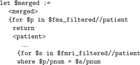 Next, a view of the fmri database is assigned to the variable $fmri_view via dxq:xbatch, a shortcut function that directs xqueries to the fMRI Wix wrapper in Figure 1