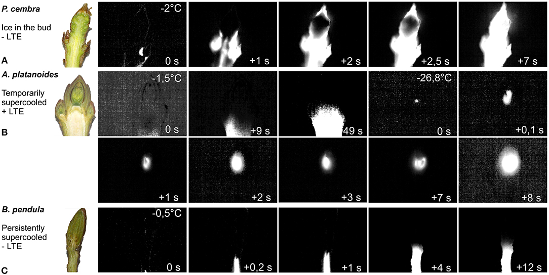 Figure 1. Digital color image (left) of longitudinally sectioned shoots bearing vegetative buds prior to freezing (enlarged images: Supplementary Figure 2) and IDTA images of the buds during controlled freezing at 4 K/h. Images were obtained at temperatures indicated in the upper right corner. (A) P. cembra, an example of buds that exhibit extracellular freezing (Supplementary Video 1). (B) A. platanoides: buds that exhibit supercooling. Initial ice formation occurs at −1.5°C below the bud in the adjoining stem but does not enter the bud (Supplementary Video 2). More than 6 h later, below a certain critical threshold temperature (−26.8°C), an ice nucleation event inside the bud triggers intracellular lethal freezing of all of the bud cells within 8 s (Supplementary Video 3). (C) B. pendula: buds supercool after the initial freezing of the surrounding tissue at −0.5°C, which stops below the bud (Supplementary Video 4). No further freezing process is detected, even at temperatures below the frost killing temperature. Freezing exotherm temperatures are indicated in the top right corner of each image. The time span during each freezing exotherm (in seconds) is indicated in the bottom right corner.
