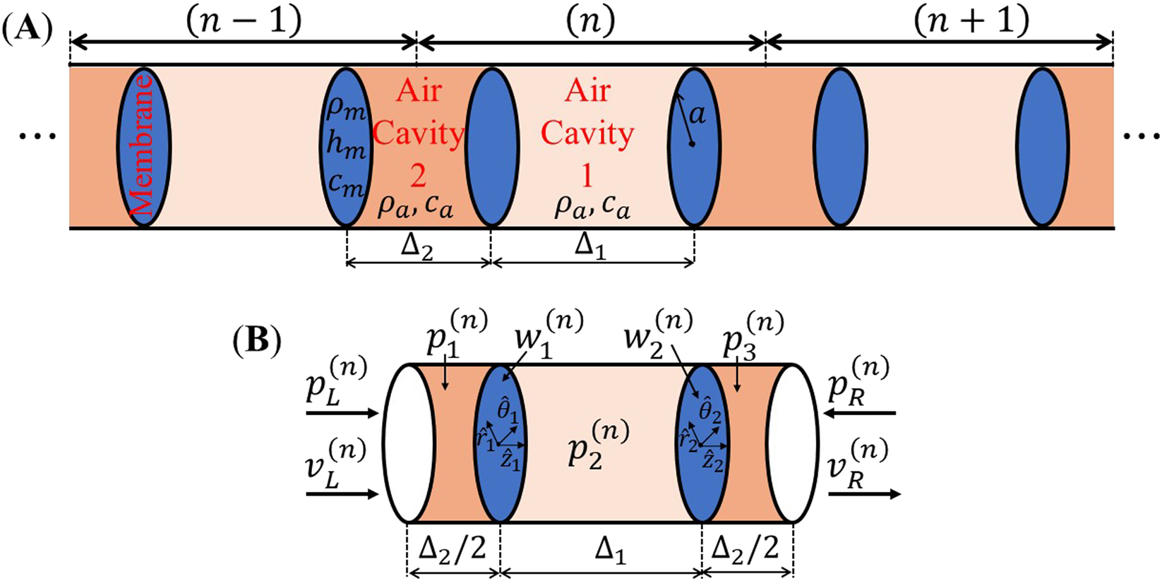 We investigate a cylindrical (axisymmetric) acoustic duct embedded with an infinite array of multilayered membrane resonators, forming a phononic vibroacoustic metamaterial. This structure consists of coupled multilayered repetitive unit cells creating a periodic lattice. Figure 1A provides a schematic of three adjacent unit cells in this periodic arrangement which is of infinite spatial extent. Each multilayered unit cell includes layers of membrane-air cavity resonators arranged in the following sequence: Half of Cavity 2, Membrane 1, Cavity 1, Membrane 2, and another half of Cavity 2. A detailed view of a representative unit cell is presented in Figure 1B, having inversion symmetry with respect to its center. The radius of the duct, denoted as , is consistent for both the circular membranes and the cylindrical cavities. Cavity 1 and Cavity 2 have depths labeled as and , respectively. The air within these cavities has density and sound speed . The membranes are identical, clamped at their edges, and have uniform properties, namely, thickness , material density , and speed of elastic wave propagation . The membrane thickness is considered negligible compared to the cavity depths (), making the characteristic length of the unit cell equal to . We assume that the transverse vibration amplitudes of the linearly elastic membranes are small enough for linear infinitesimal elasticity to be applicable.