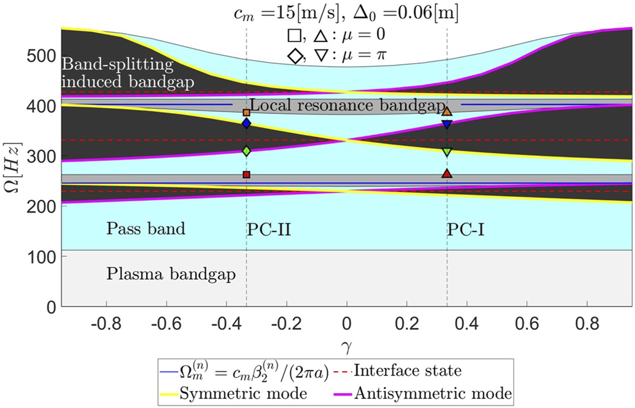 Prior to examining the topological structures of infinite vibroacoustic lattices composed of PC-I or PC-II unit-cells, we utilize the derived analytical pressure distribution inside the three cavities along a representative unit-cell, as provided in Equation 6, to assess the symmetry of the eigenmodes at the bounding frequencies of the band-splitting induced bandgaps (i.e., band-edge states). To this end, the eigenmodes corresponding to and exhibiting the band inversion phenomenon, can be classified into symmetric or antisymmetric modes, as indicated by the yellow and magenta curves, respectively, in Figure 2. This classification procedure is based on the pressure profile inside a representative unit-cell, as will be shown in Figure 4. The evolution of the interface states as γ varies, depicted by the dashed red line in Figure 2, will be analyzed and discussed subsequently.