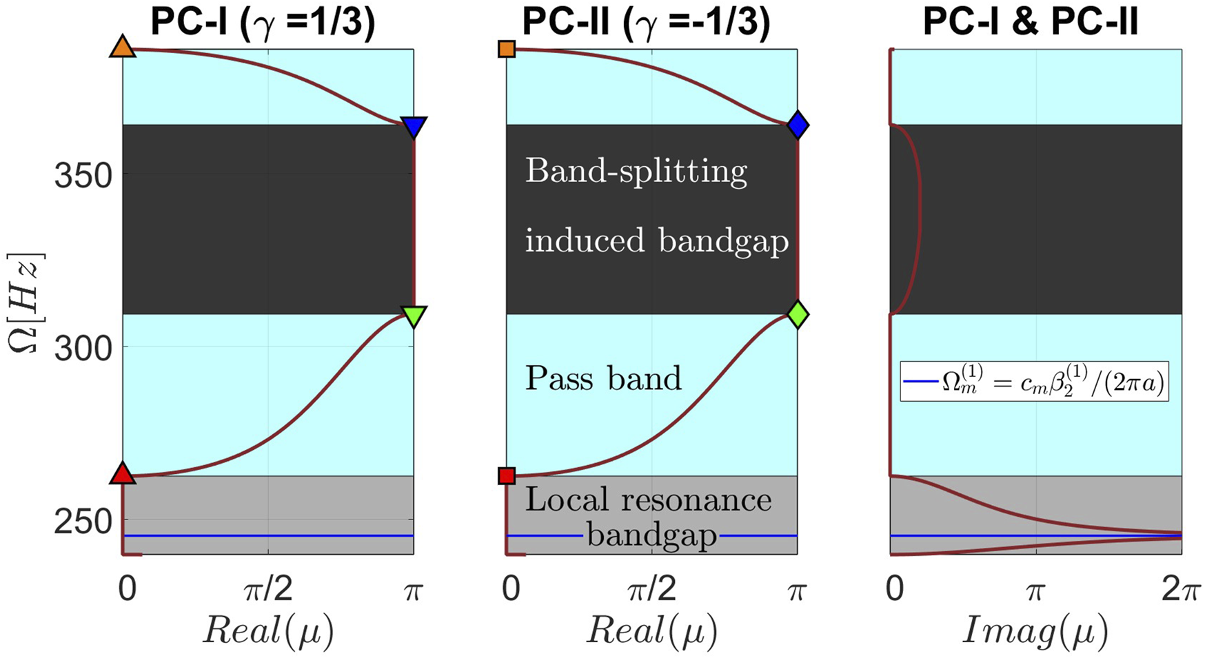 The third and fourth bands/bandgaps of the band structure for infinite lattices composed of uniform PC-I or PC-II unit-cells. Real and imaginary parts of the propagation constant, , shown in dark brown, are calculated based on Equation 17. The system parameters, marked bounding frequencies, and color interpretations are consistent with Figure 2.