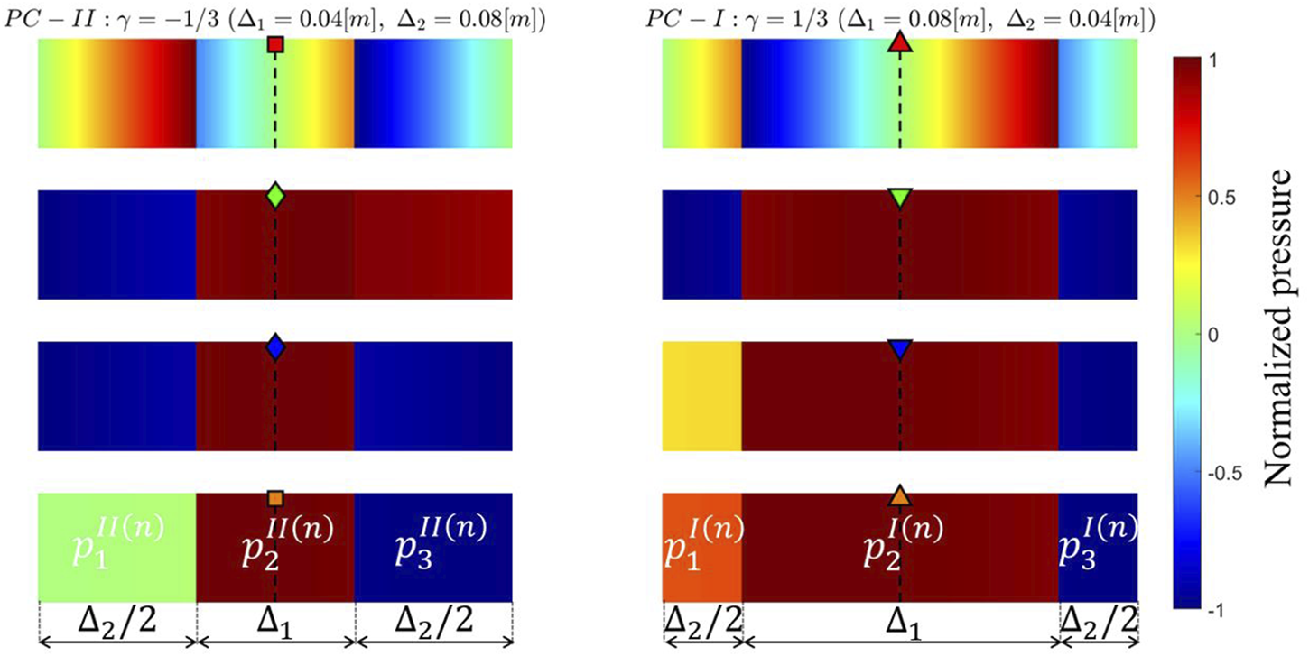 Where the amplitudes and are treated as inputs, and is the constant operation frequency. Then, the corresponding explicit expressions for the acoustic pressure fields inside the air cavities of the unit cell are given by: