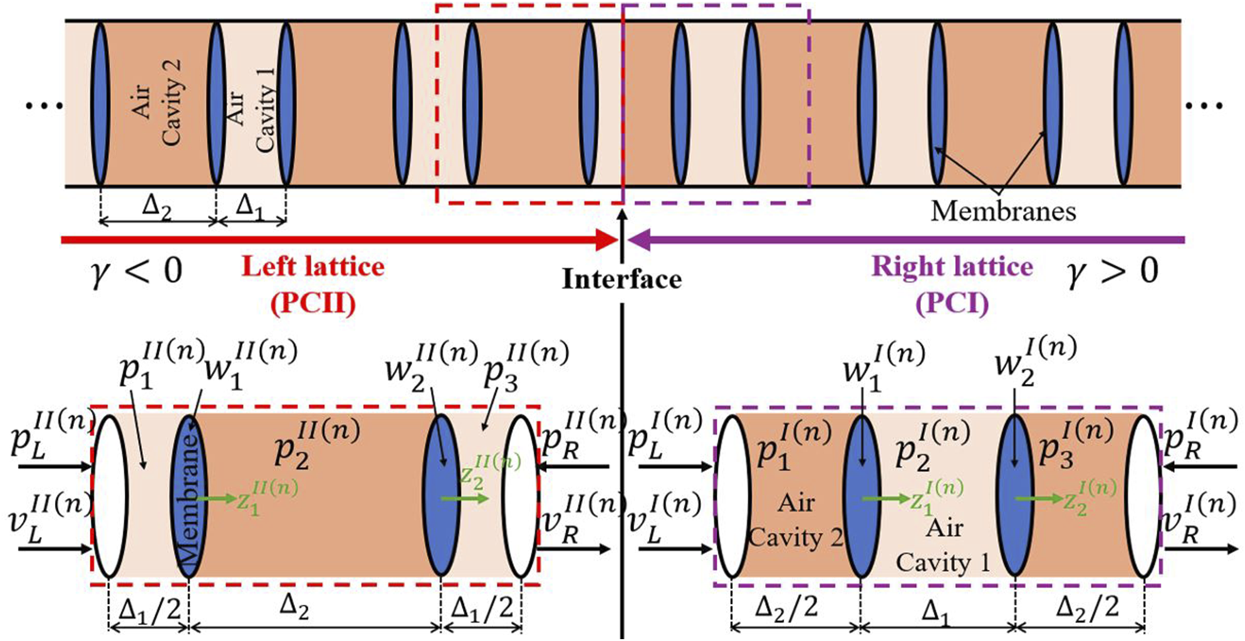 A detailed analysis, based on the transfer matrix method, of a generalized version of this multilayered vibroacoustic lattice, where each unit cell is constructed from two distinct membranes and cavities, was recently reported in (Gzal et al., 2024b). However, the selection of the unit cell was different from our choice in the current study. Here, the unit cell is shifted (compared to the case in (Gzal et al., 2024b)) to preserve inversion symmetry. As a result, while the band structure remains identical and independent of the unit cell selection, the acoustic pressure distribution along the unit cell, as well as the components of the transfer matrix in this study, will be different from those derived in (Gzal et al., 2024b). Furthermore, altering the basis of the unit cell changes the geometric phase accumulated by the eigenmodes, such as changing the Zak phase from that of the unit cell in (Gzal et al., 2024b). Therefore, for the inversion symmetry case selected here, the governing equations and boundary conditions will be detailed, followed by the final analytical solution for the coupled vibroacoustic phononic lattice.