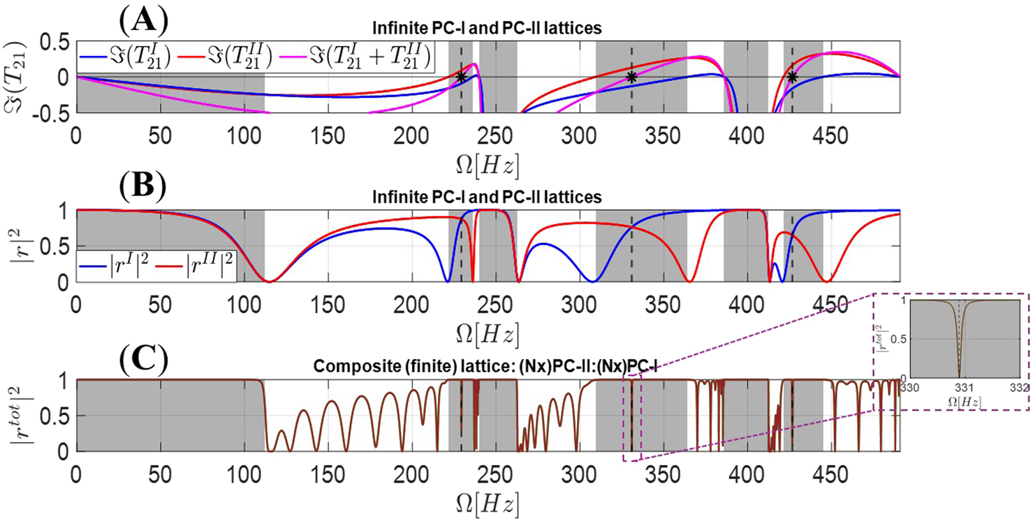 Lastly, further perspective on the physical mechanism governing the formation of interface states in the composite vibroacoustic lattice of Figure 5, can be gained from the viewpoint of reflection coefficients for the component right (I) and left (II) semi-infinite lattices. From Equation 15, the corresponding reflection coefficients, denoted by and , respectively, are expressed as follows: