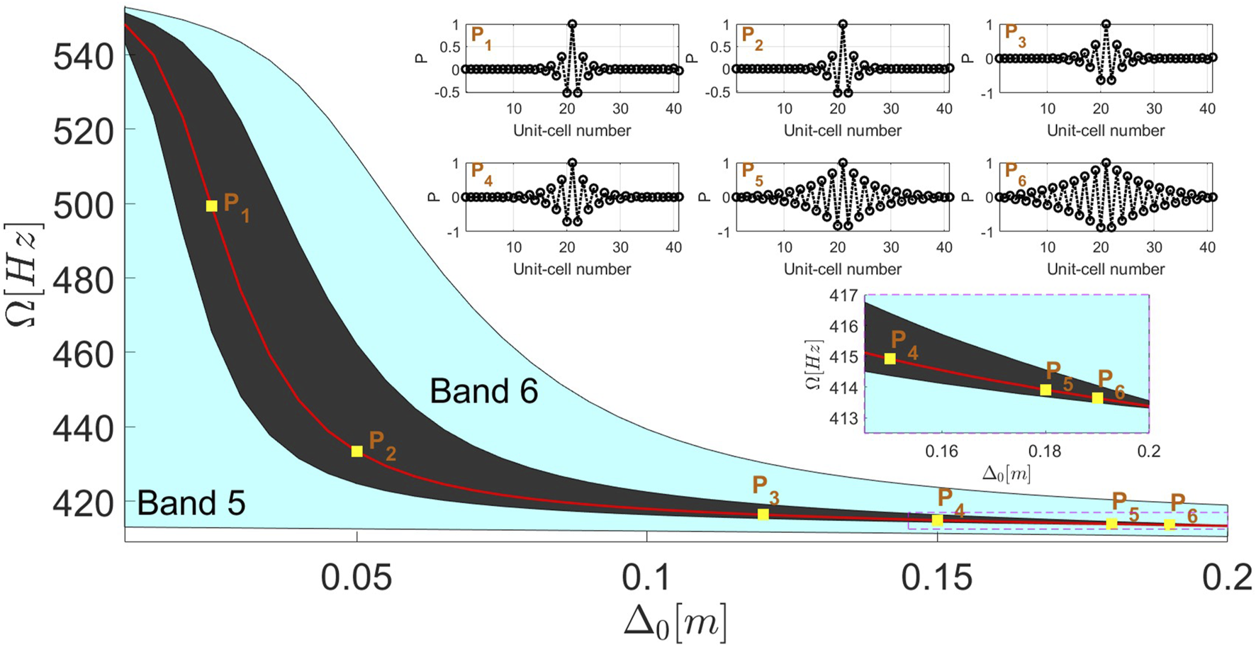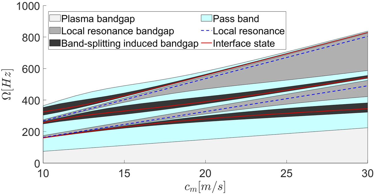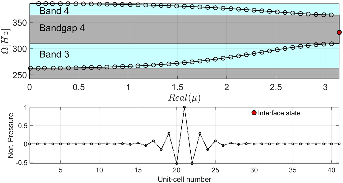 After introducing the components of the local transfer matrices from Equations 22–29 and performing algebraic manipulations, the following transcendental frequency equation for determining the exact location of the interface state within the bandgap () is obtained,where, the relations for , and are taken from Equation 12. Additionally, and , are expressed as functions of the contrast parameter and the nominal cavity depth from Equation 20. Equation 30 reveals that the frequency of an interface state is independent of the contrast parameter. This observation is consistent with the results shown in Figure 2, where the horizontal dashed red lines represent the interface states with no dependence on . Remarkably, Equation 30 offers a direct tool for the predictive design and adjustment of interface states based on the system’s physical parameters. To the best of our knowledge, such a direct relationship has not been previously reported for either realistic or even discrete systems. This predictive design tool is expected to enable a deeper understanding of sound-matter interactions at a fundamental level and to harness the power of topology for energy management in vibroacoustic systems, paving the way for a new generation of lightweight and controllable sound-based structures. Additionally, the procedure proposed here to derive Equation 30 using the transfer matrix formalism is not limited to vibroacoustic systems; it can be applied to any photonic or phononic system with an inversion-symmetric unit cell. This broad applicability emphasizes the significance of our methodology, making it a powerful and versatile tool for analyzing and designing topological states across various physical systems.