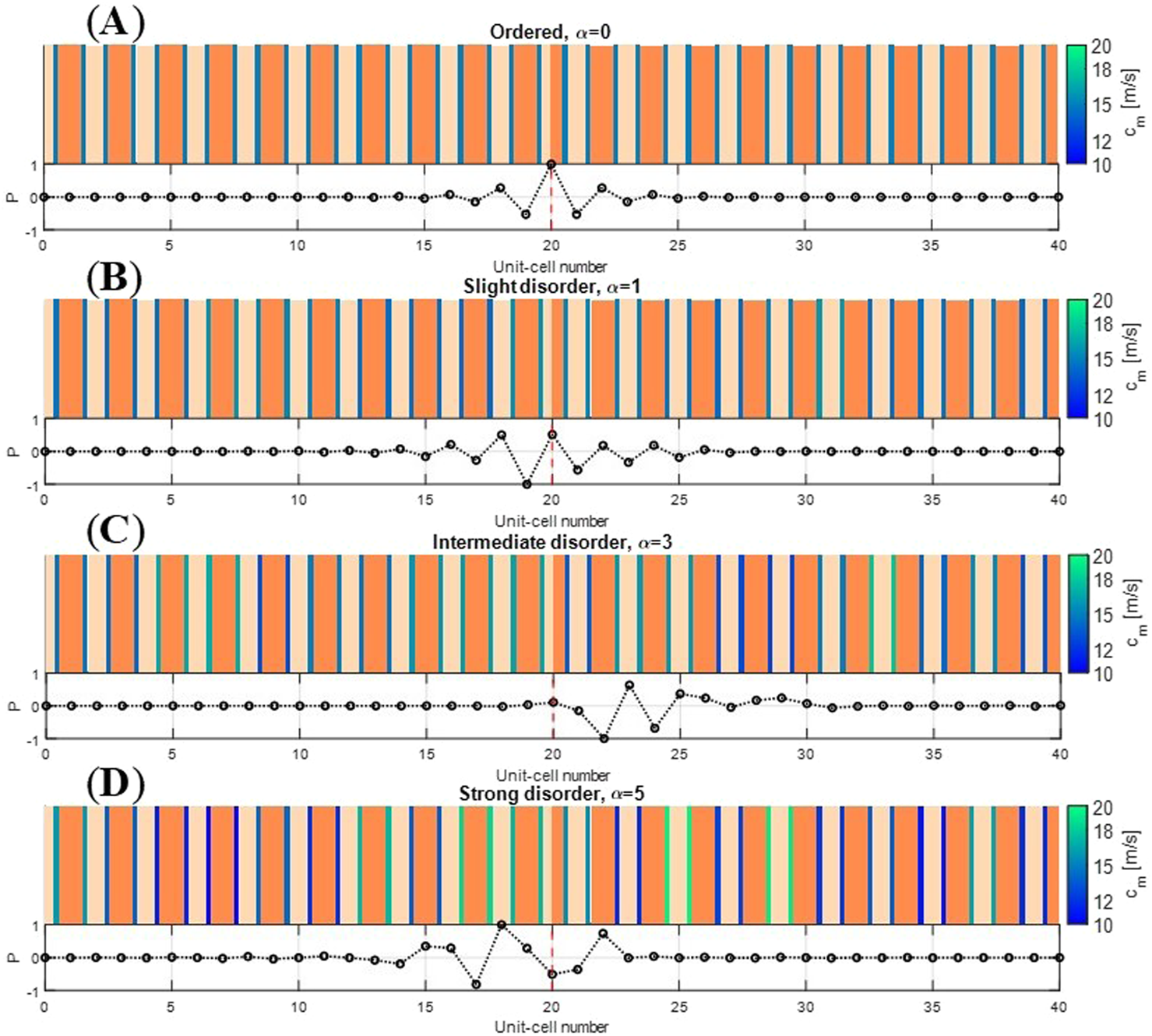By construction, both PC-I and PC-II sub-lattice configurations possess the same “spatial period” (), and the same propagation constant, which yields to identical band structures. However, the two sub-lattices exhibit different band topologies, as determined from the analysis of the semi-infinite lattices in the previous sections. Consequently, localized interface states are expected to emerge in the interfacial region of the finite vibroacoustic lattice as well. We aim to study the robustness of these localized interface states, which, until this point, were predicted solely based on the semi-infinite left and right lattice perspective.