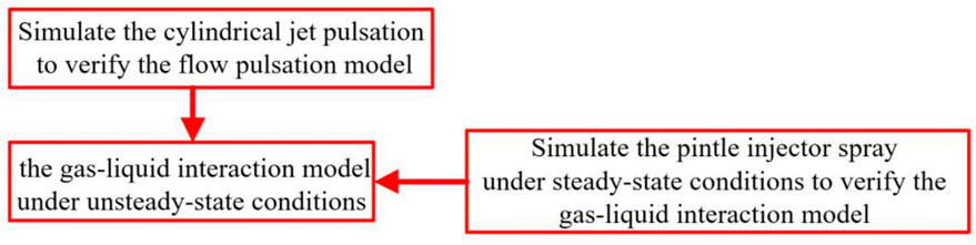 Since experimental research about the effects of upstream pulsation on spray performance of a pintle injector has not been published, in the current study, to verify the accuracy of the numerical model, two validation cases are carried out. The verification process is shown in Figure 5.
