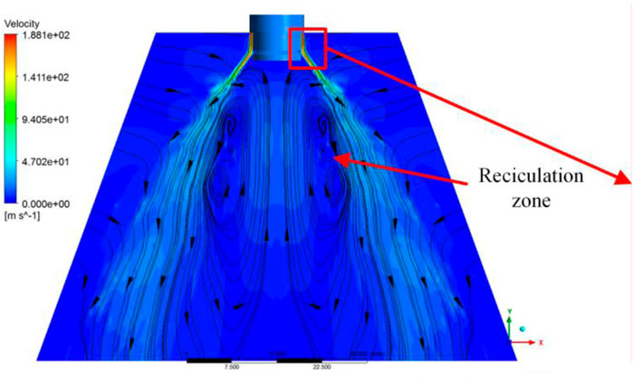 Figure 9 shows the streamline and velocity contour of case 1(f = 0). There are recirculation zones in the central region of the spray field. The outside droplets enter the central recirculation zone. After the gas and liquid collide, the velocity rapidly decays from 184 m/s at the gas outlet of the pintle injector to about 70 m/s. During this gas–liquid colliding process, there is a momentum exchange between the gas and the liquid. The impact of the gas on the liquid film makes the liquid film fluctuate. As the liquid film develops downstream, the thickness of the liquid film rapidly decreases, which promotes the breakup of the liquid film, as shown in Figure 10.
