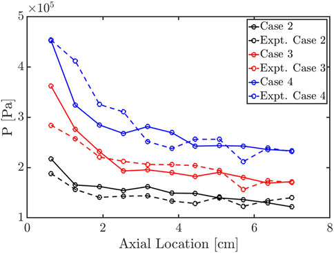FIGURE 4. Average axial pressure distributions of RAI RDE cases at outer chamber wall for simulations as well as experimental data from Rankin et al. (2017).