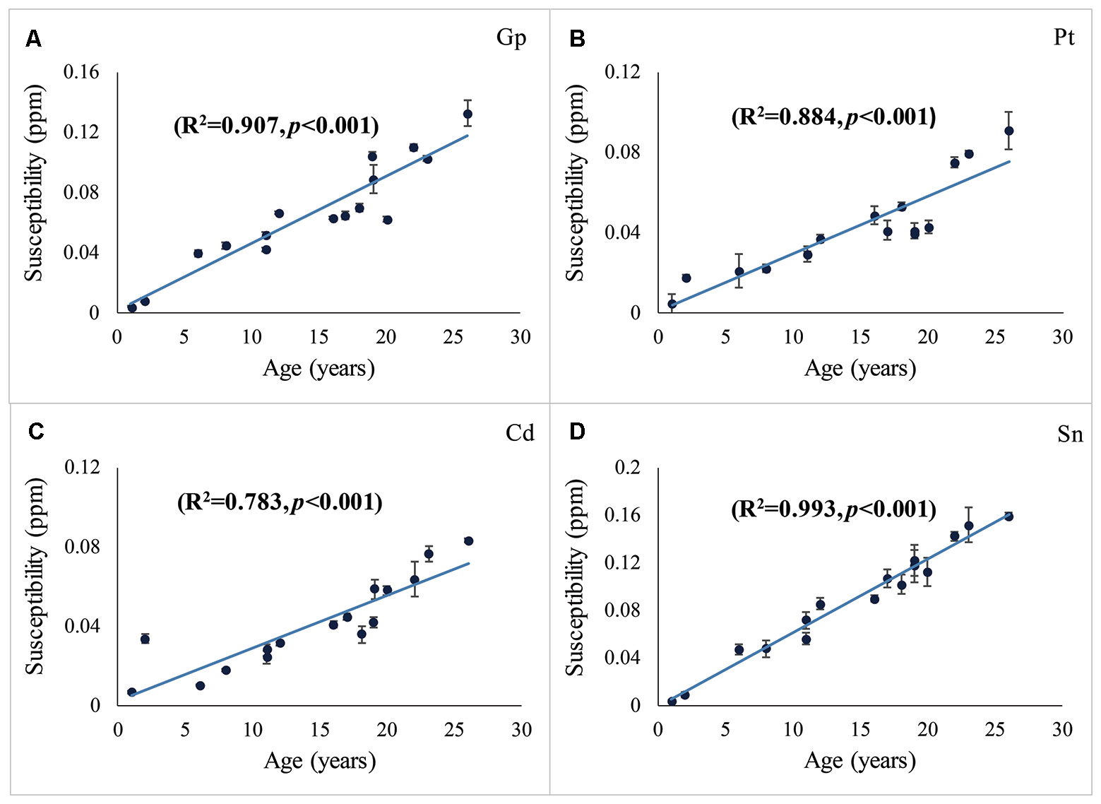 | Sn | χ = 0.00619·age − 0.00216 | 0.993 | 0.987 | <0.001 |