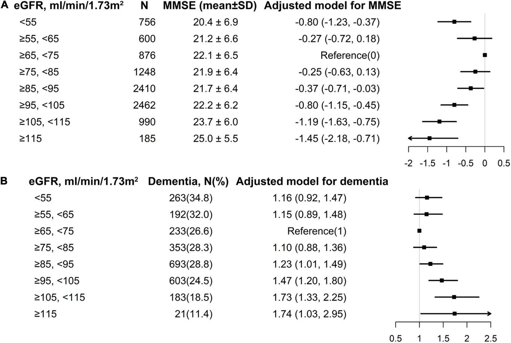 Multivariate logistic regression of eGFR with MMSE and dementia among individuals divided into 10 ml/min/1.73 m2 intervals of eGFR levels. (A) eGFR with MMSE; (B) eGFR with dementia. Each black square represents the effect size of the study together with the 95% CI. (A) eGFR with MMSE; (B) eGFR with dementia. All analyses were adjusted for sex, age, body mass index, systolic blood pressure, diastolic blood pressure, education (except in Figure 1B), coronary heart disease, diabetes mellitus, smoking status, alcohol consumption, homocysteine, total cholesterol, triglycerides, high-density lipoprotein, and antihypertensive drugs.