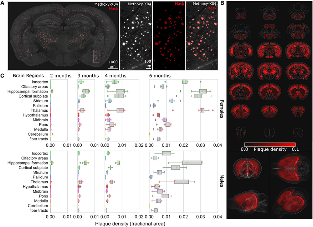 Mice were given an intraperitoneal injection of methoxy-X04 (5 mg/kg) to label amyloid plaques. Twenty-four hours after injection, mice were euthanized by injection of ketamine/xylazine (0.1 mL/10 g) and sequentially perfused with 1× PBS and 4% PFA. Intact brains were dissected and post-fixed in 4% PFA for 12–24 h at 4°C. Whole-brain serial two-photon (STP) tomography imaging was performed using a TissueCyte 1000 (TissueVision, Inc.) (Ragan et al., 2012). Brain samples were imaged at 780 nm with 220 mW measured at the objective, and emitted fluorescence was captured across three channels (ch1: 560–680, ch2: 500–560, and ch3: 400–500 nm). Methoxy-X04 fluorescence was predominantly identified in channel 3. One hundred and forty serial block-face images were acquired at 100 μm spacing for each brain at ∼1.4 μm/pixel XY sampling. Automated segmentation of the fluorescent signal from methoxy-X04 labeled plaques across all sections was performed by local threshold-based segmentation. The relative signal intensity between the tissue autofluorescence signal identified in channel 1 and the methoxy-X04 signal identified in channel 3 was first computed by channel subtraction to remove the local background autofluorescence and identify the methoxy-X04 signal. A manually defined threshold was then applied to the background-subtracted methoxy-X04 signal to minimize false positives and generate a plaque mask for each section. This background subtraction also reduced broad-spectrum false positive signal intensities identified across all three channels often identified around the olfactory bulbs. The imaging and segmentation parameters were held constant across all samples and all ages (2 months – eight females, eight males; 3 months – seven females, eight males; 4 months – eight females, six males; 6 months – eight females, five males). To map brain regional plaque densities, the Allen Brain Reference Atlas was registered onto each brain sample using the Allen Mouse Brain Common Coordinate Framework v3 (CCFv3) (Wang et al., 2020). Briefly, the 10 μm average template brain from the CCF was registered to a 10× down-sampled version (14 μm × 14 μm × 100 μm XYZ) of each brain sample using a multi-resolution coarse-to-fine linear to non-linear series of transformations (Ragan et al., 2012; Kuan et al., 2015), and the corresponding Atlas Annotations were then registered using the computed transform matrix. The masked plaque density (fractional area) was mapped for each brain region across sections by computing the ratio of total masked pixels to total region pixels across all sections after up-sampling of the atlas annotation section to the full resolution STP datasets.