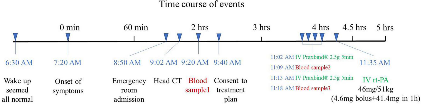 Acute ischemic stroke is a serious threat to the health of Chinese residents and increased yearly. It is the leading cause of death for urban residents in China and characterized by high morbidity and lethality, high rate of recurrence and disability, and high treatment cost. Cardiac embolism secondary to non-valvular atrial fibrillation (NVAF) accounts for 13–26% of ischemic stroke patients for whom long-term and stable anticoagulant therapy is very important (Ist-3 collaborative group, 2015; Seiffge et al., 2019). Compared with warfarin, novel oral anticoagulant (NOAC) significantly reduced the incidence of stroke by 19%, among which dabigatran significantly reduced the incidence of stroke by 34%. There was no significant difference in the overall incidence of major bleeding between the two (Ruff et al., 2014). Thus, clinical application of NOAC has been both recommend by “2019 AHA/ACC/HRS Guideline for the Management of Patients with Atrial Fibrillation” and the “Guideline of stroke prevention in Chinese patients with atrial fibrillation (2017)” (Zhang et al., 2017; January et al., 2019). In order to save the patients’ lives and improve the prognosis, it is particularly critical to treat the patients with corresponding antagonists when life-threatening bleeding or emergency surgery/treatment occurs in the users of NOAC as their widespread clinical application in China. Idarucizumab, an antagonist of dabigatran, was approved in China in February 2019. However, there is still very limited data on the efficacy and safety on idarucizumab’s use in China. Here, we report the first case of acute stroke using the recombinant tissue plasminogen activator (rt-PA) intravenous thrombolysis after the reversal of dabigatran anticoagulation with idarucizumab within the time window of thrombolysis in China.