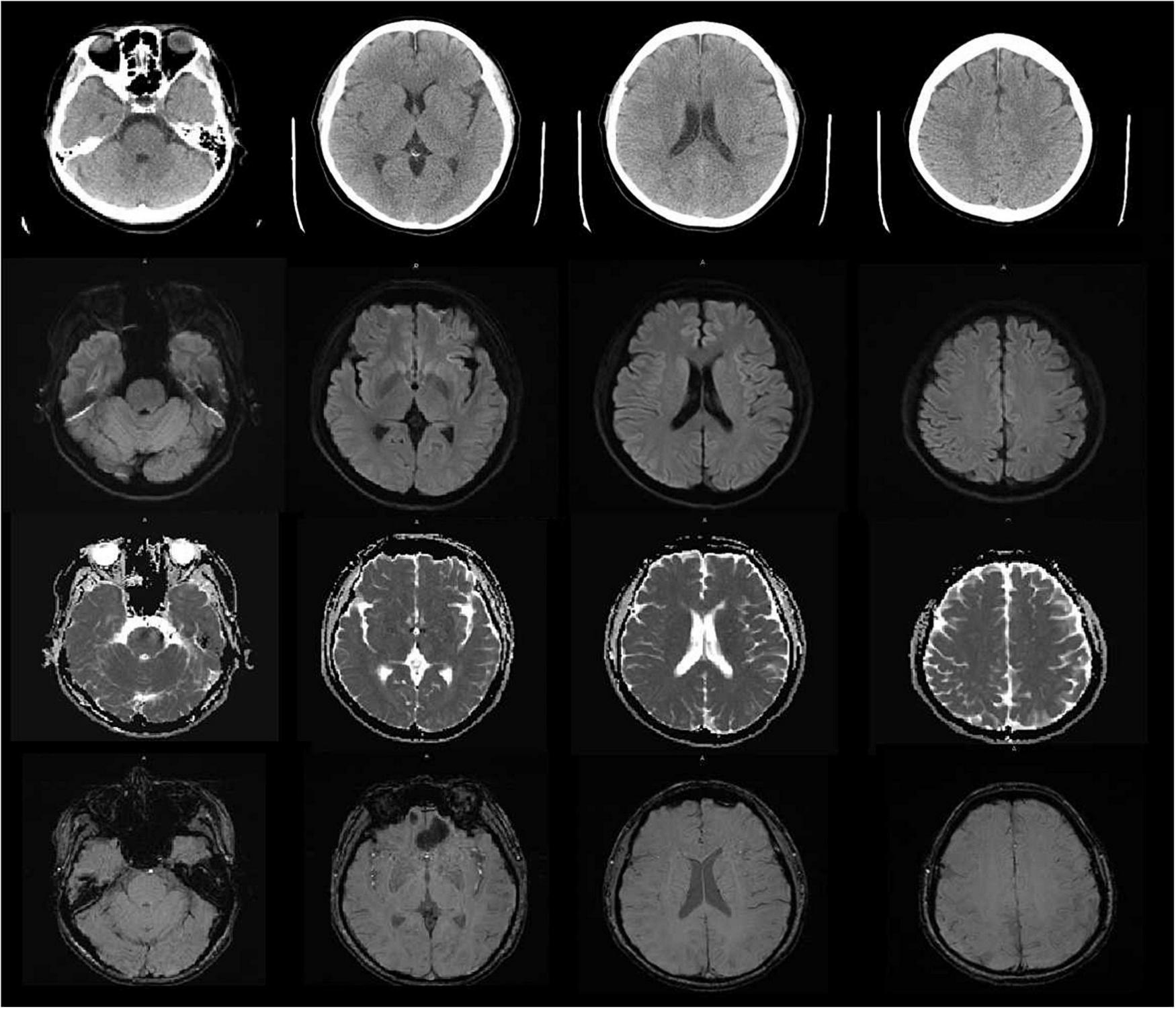 The cranial MRI showed no abnormal signal was found in T1-weighted imaging, T1WI (TI), T2-weighted imaging, T2WI (T2), diffusion-weighted imaging (DWI) and susceptibility weighted imaging (SWI).