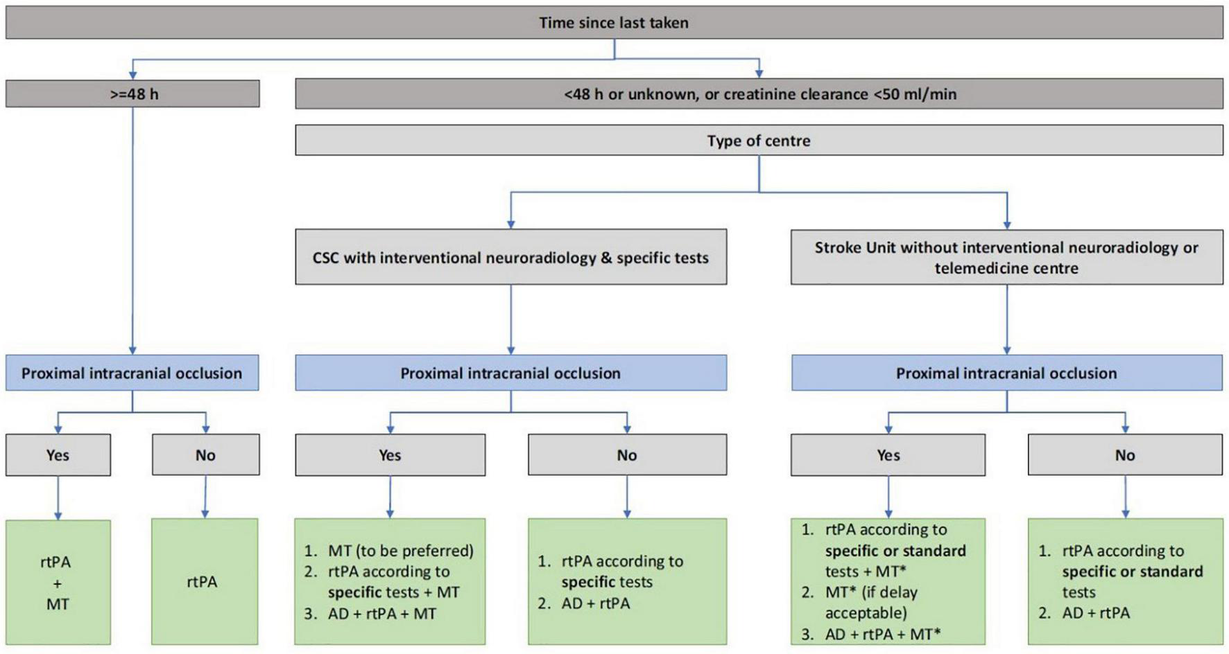 The different treatment of acute ischemic stroke in patients according to the last dosing time of novel oral anticoagulant, renal function, stroke center qualification.