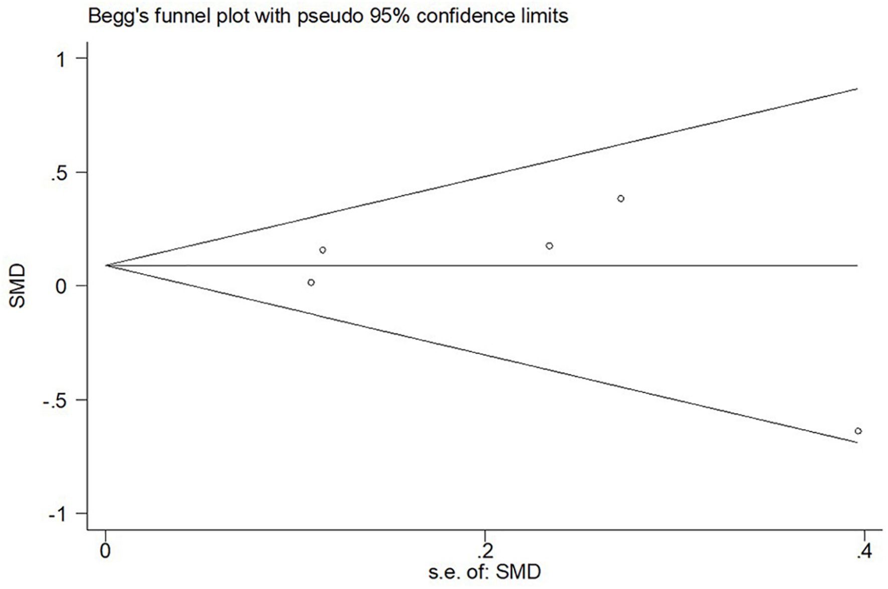In the sensitivity analysis of the meta-analysis of “age difference ≤ 2 years” group, one eligible study was excluded at a time to assess the influence of each dataset on the pooled SMD. We observed no changes in the corresponding pooled SMD or in the significance of the results (Figure 4), which indicated that our results were significantly stable to the study-selection process. The publication bias was assessed using the Begg’s funnel plot and Egger’s test (Figure 5). The results of Begg’s funnel plot and the modified Egger linear regression test showed no publication bias (Z = −0.24, p = 1.000; t = −0.34, p = 0.753).