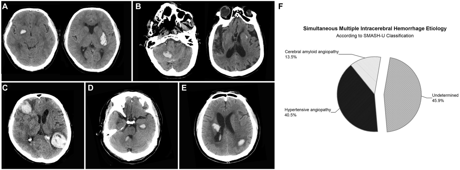 Representative examples of patients with simultaneous multiple intracerebral hemorrhage (SMICH). According to SMASH-U classification, patients who had ICH restricted to deep (A) or infratentorial (B) regions with pre-ICH hypertension were classified as hypertensive angiopathy; Cerebral amyloid angiopathy (CAA) was defined by patients aged ≥55 with lobar hematoma (C). Patients with co-existing lobar and deep/infratentorial ICH were classified as undetermined-SMICH (D,E). Cerebral amyloid angiopathy (n = 5 [13.5%]) and hypertension (n = 15 [40.5%]) were common classifications, whereas 17 (45.9%) patients with primary SMICH had an undetermined etiology (F).