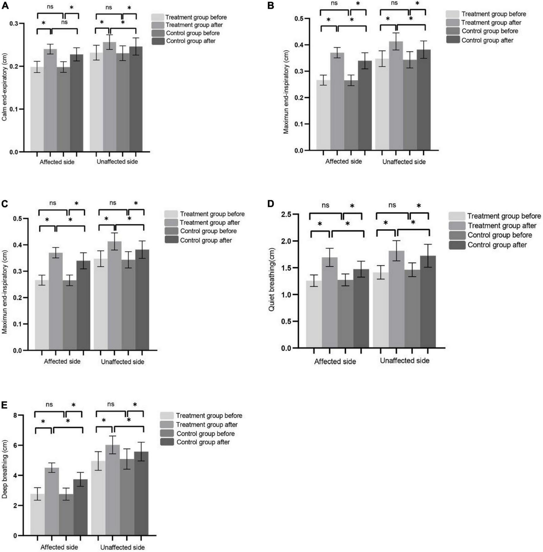 (A–C) Represents CEE, MEI, and DTF of the affected side and non-affected side before and after treatment in the control group and the treatment group, respectively. (D) The DM of affected side and unaffected side during QB before and after treatment in control and treatment group. (E) The DM of affected side and unaffected side during DB before and after treatment in control and treatment group. (*P < 0.05), ns (P > 0.05).