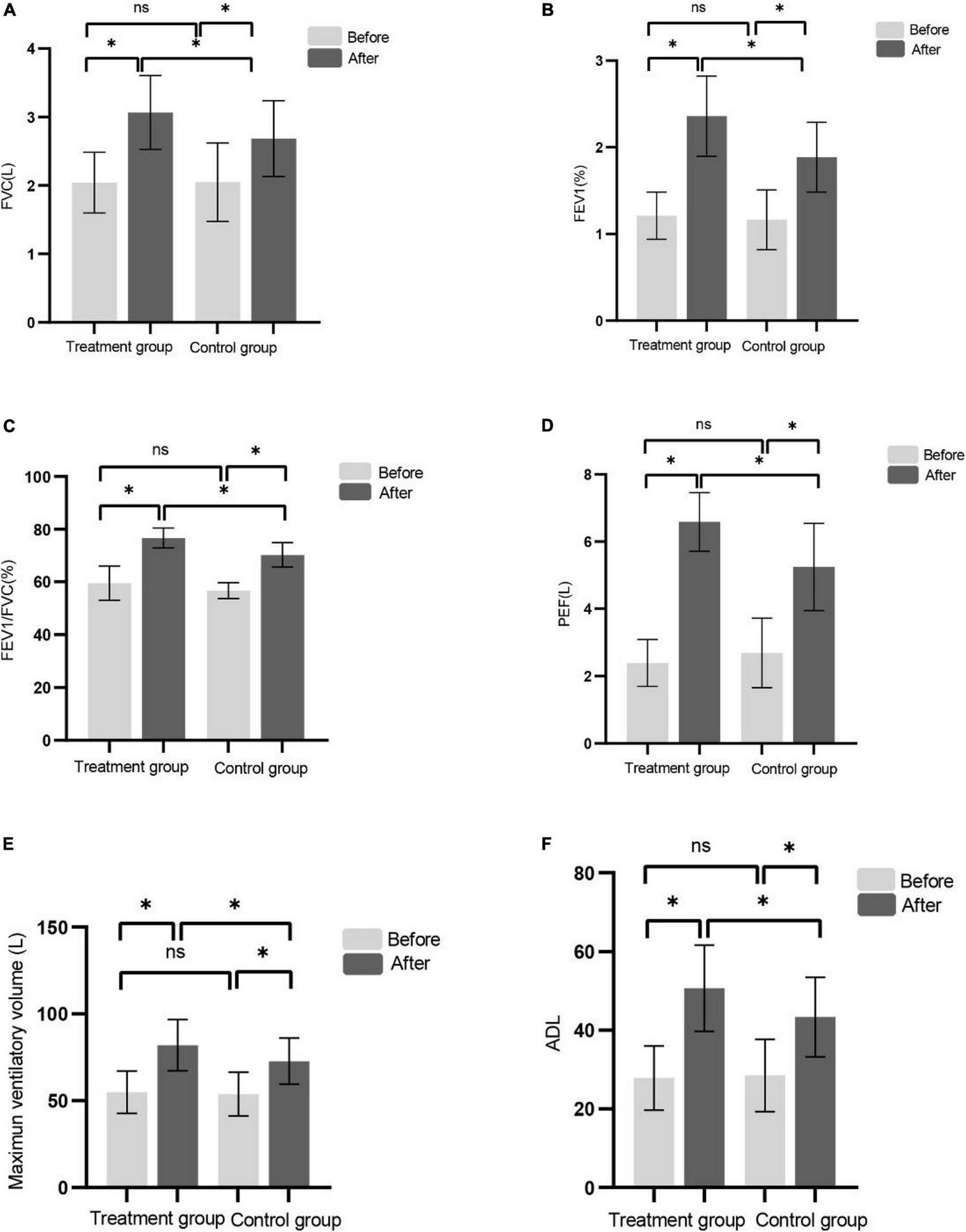 (A–F) Shows FVC, FEV1, FEV1/FVC, PEF, MVV, and ADL before and after treatment in the control group and the treatment group, respectively. (*P < 0.05), ns (P > 0.05).