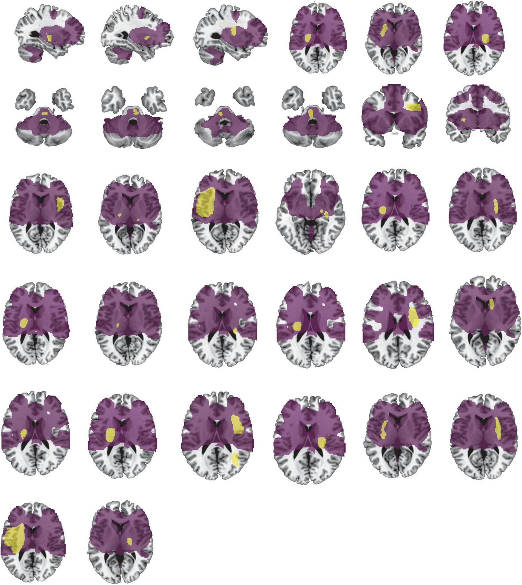 Lesion network involves the location of lesions causing PSS. Our lesion network of PSS involves the location of lesions in 31/32 patients identified in the PSS group. Lesions of PSS (yellow) are the same as in Figure 2. The lesion network of PSS is shown in purple.