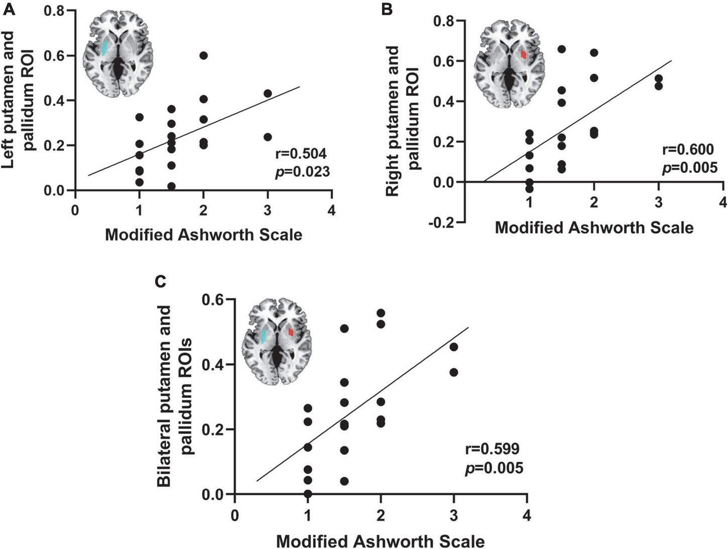 Correlation between spasticity and the putamen and globus pallidus. The functional connectivity of the right putamen and globus pallidus ROI (A), the left putamen and globus pallidus ROI (B), and the bilateral putamen and globus pallidus (C) to lesions causing PSS was positively correlated with the MAS score.