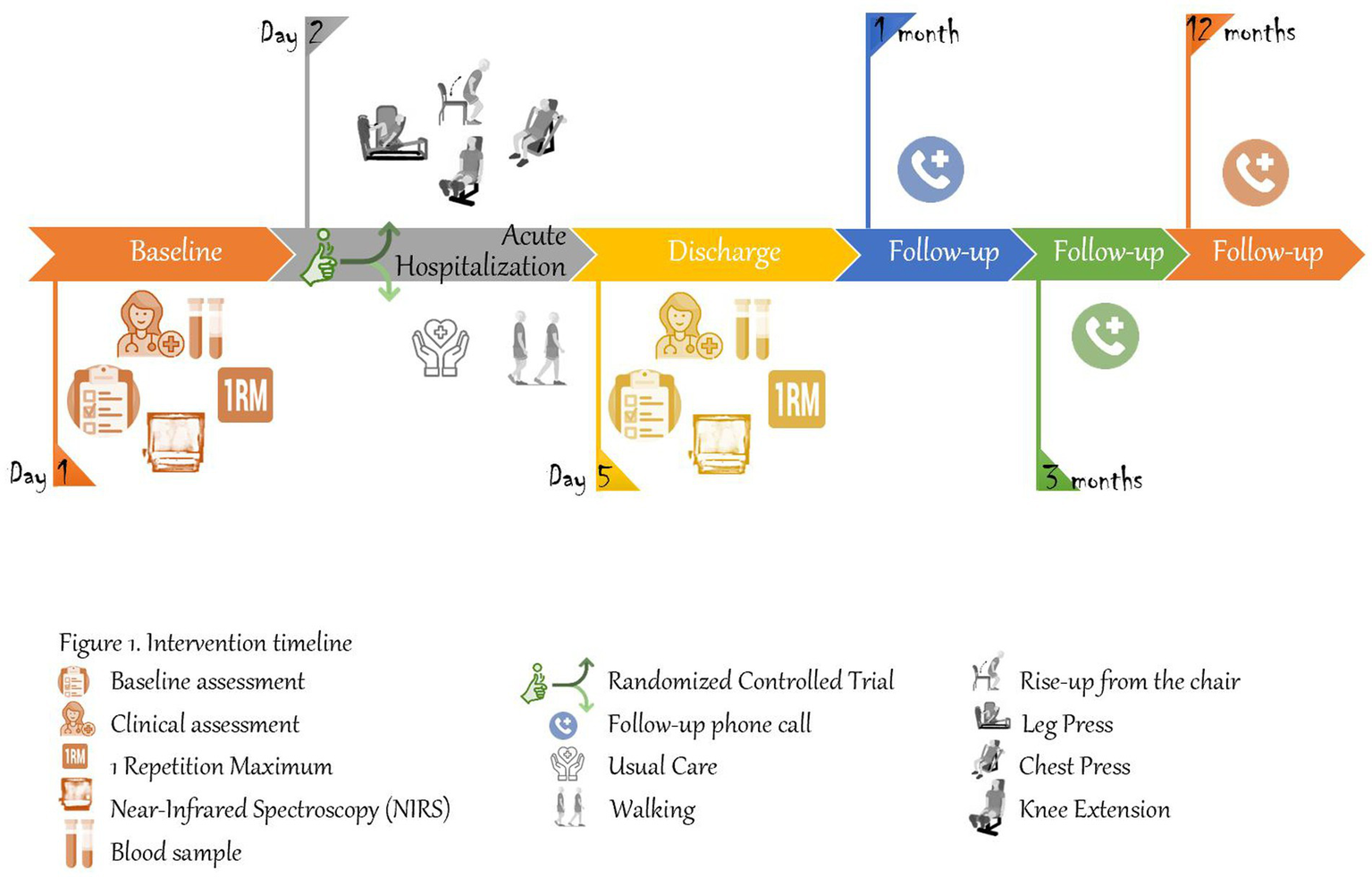 The intervention will consist of a multicomponent exercise training program adapted from Vivifrail to prevent muscle weakness and falls (Izquierdo et al., 2017; Casas-Herrero et al., 2022) and the training protocol was detailed in previous literature (Martínez-Velilla et al., 2015, 2016, 2019, 2022). It will be composed of supervised progressive resistance exercise training, balance training, and walking for 3 consecutive days. During the training period, patients will be trained in 30 min sessions once a day (morning). The supervised multicomponent exercise training program will be comprised of upper and lower body strengthening exercises, tailored to the individual’s functional capacity, using weight machines and aiming for 2–3 sets of 8–10 repetitions at an intensity of 50–70% of 1RM (Matrix, Johnson Health Tech, Ibérica, S.L. Torrejón de Ardoz, Madrid, Spain). A “1RM” signifies the maximum resistance a person can move in one repetition of an exercise. The resistance exercises focused on the major upper and lower limb muscles. On the second and third training days, patients do 2 sets of 10 chair squats. Each resistance training session will include 2 exercises for the leg extensor muscles (bilateral leg press and bilateral knee extension machines) and 1 exercise for upper limbs (seated bench press machine). During the progressive resistance training, instruction will be provided to the participants to perform the exercises at a high velocity of motion. However, care will be taken to ensure that exercises are executed with correct form. In the first assessment, the patients will warm up with specific movements for the exercise test. Each subject’s maximal load will be determined in no more than five attempts. During all neuromuscular performance tests, a strong verbal encouragement will be given to each subject to motivate them to perform each test action as optimally and rapidly as possible. Three experienced physical trainers (FZF, IOM, and ADM) will carefully monitor and supervise all training sessions and provide instruction and encouragement. Adherence to the exercise intervention program will be documented in a daily register of sessions and adverse events including muscle pain, fatigue, falls and general aches will be recorded by the training staff. Participants and their family members will be carefully familiarized with the training procedures in advance. The intervention exercises are detailed in Table 2 and the training protocol is shown in Figure 2.