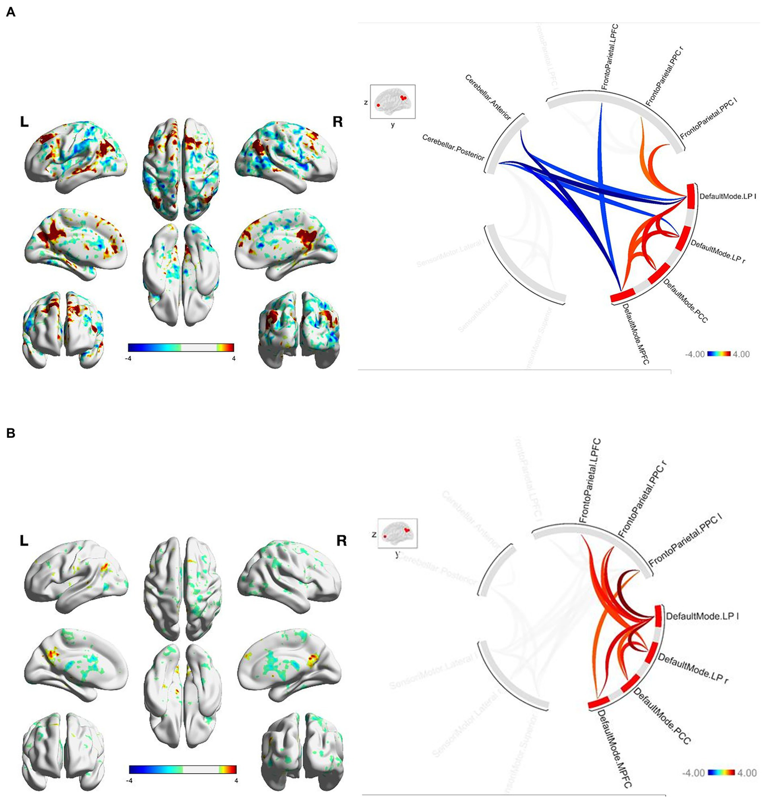 (A) FGA-related DMN connectivity at baseline. For connectome ring: bottom right quadrant contains nodes of the DMN, top right quadrant contains nodes of the FPN, the top left and bottom left quadrants contain nodes of the cerebellum and SMN. At baselight greater FGA score was associated with: greater within-network connectivity within the DMN (uncorrected p < 0.01); greater connectivity between the DMN and FPN (uncorrected p < 0.01); lower connectivity between the DMN and cerebellum (uncorrected p = 0.02). (B) FGA-related DMN connectivity over 26-weeks (26 week – baseline). For connectome ring: bottom right quadrant contains nodes of the DMN, top right quadrant contains nodes of the FPN, the top left and bottom left quadrants contain nodes of the cerebellum and SMN. At 26-weeks greater FGA score was correlated with: greater within-network connectivity within the DMN (uncorrected p < 0.01); greater connectivity between the DMN and FPN (uncorrected p < 0.01); Statistical brain maps were generated via general linear model (Z > 2.7, p < 0.05 FWE corrected).