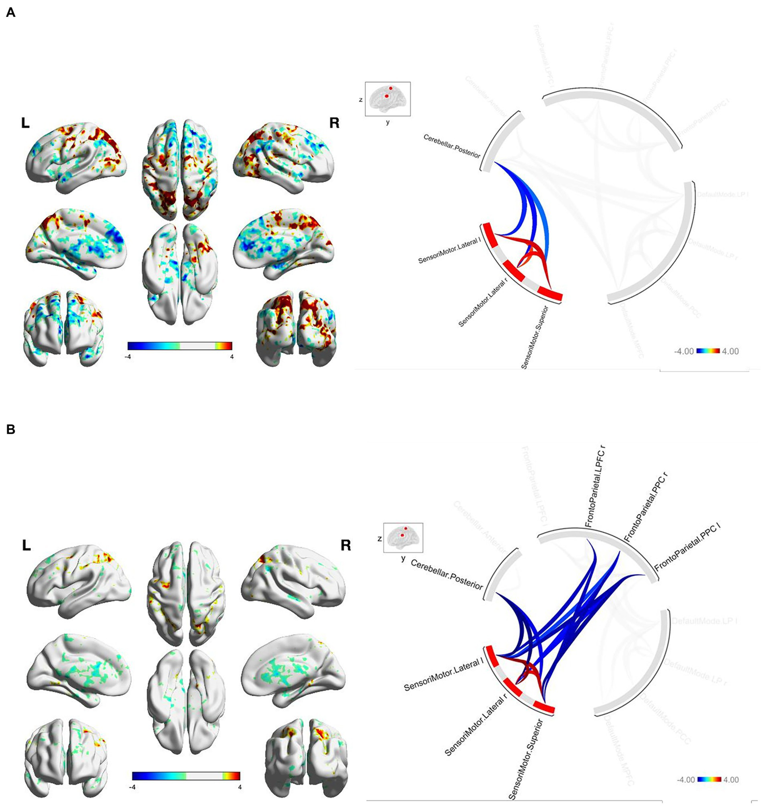 (A) FGA-related SMN connectivity at baseline. For connectome ring: bottom right quadrant contains nodes of the DMN, top right quadrant contains nodes of the FPN, the top left and bottom left quadrants contain nodes of the cerebellum and SMN. At baseline greater FGA score associated with: greater within-network connectivity within the SMN (uncorrected p < 0.01); lower connectivity between the SMN and cerebellum (uncorrected p < 0.01). (B) FGA-related SMN connectivity over 26-weeks (26 week – baseline). For connectome ring: bottom right quadrant contains nodes of the DMN, top right quadrant contains nodes of the FPN, the top left and bottom left quadrants contain nodes of the cerebellum and SMN. At 26-Weeks greater FGA score was correlated with: greater within-network connectivity within the SMN (uncorrected p < 0.01); lower connectivity between the SMN and cerebellum (uncorrected p < 0.01); lower connectivity between the SMN and FPN (uncorrected p < 0.01); Statistical brain maps were generated via general linear model (Z > 2.7, p < 0.05 FWE corrected).