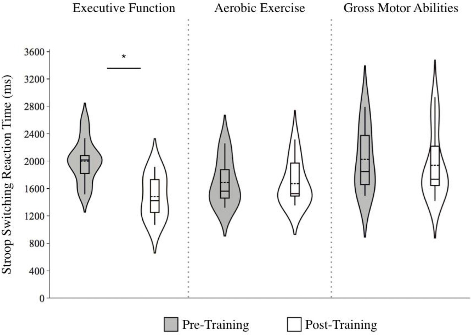 Changes in executive functions due to training were measured using a variant of the Stroop task used during training. Instead of using letters, the pre-and post-intervention variant involved digits. The assessment comprised five different conditions (familiarization, reading, counting, inhibition, and switching); however, reaction times for the inhibition and switching trials were analyzed as potential mechanisms underlying the EF training as these tasks rely most heavily on executive function. In the inhibition condition, digits were presented on the screen, whereby the number of digits was incongruent with the digit displayed (e.g., five number twos were presented). Participants were instructed to identify the quantity of digits presented, while inhibiting responses indicating the digits that were displayed on the screen. In the switching condition, the stimuli were identical to those in the inhibition condition, except that on some trials, the digits were surrounded by a white frame, to indicate a goal switch, whereby participants had to identify the digit that was presented on the screen, rather than indicating the quantity of digits.