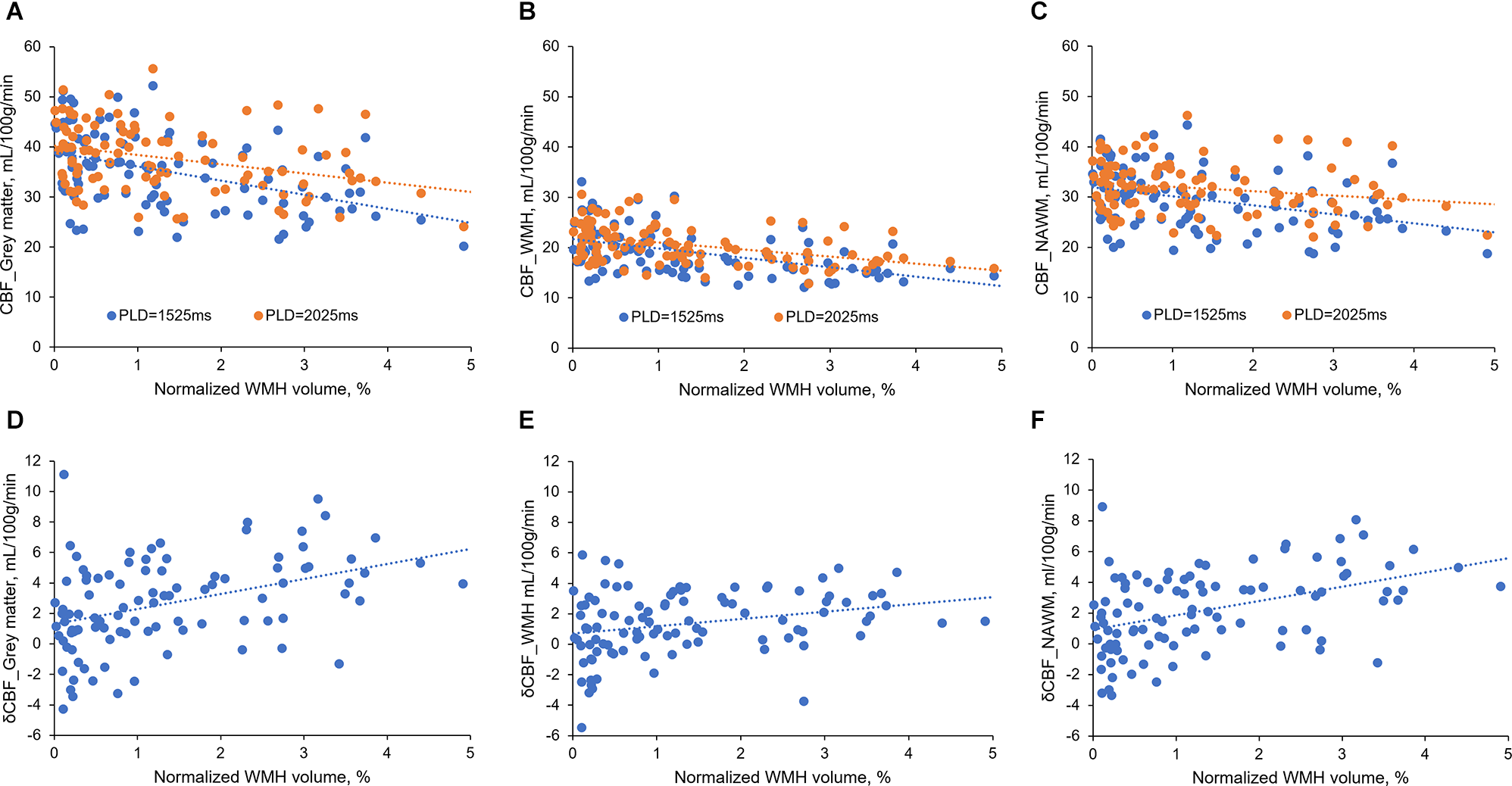 The relationship between CBFs and normalized WMH volume. (A–C) CBFs correlated with normalized WMH volume. The difference between the two CBF values became larger when WMH volumes increased. (D–F) δCBF in all three brain regions was associated with normalized WMH volume.