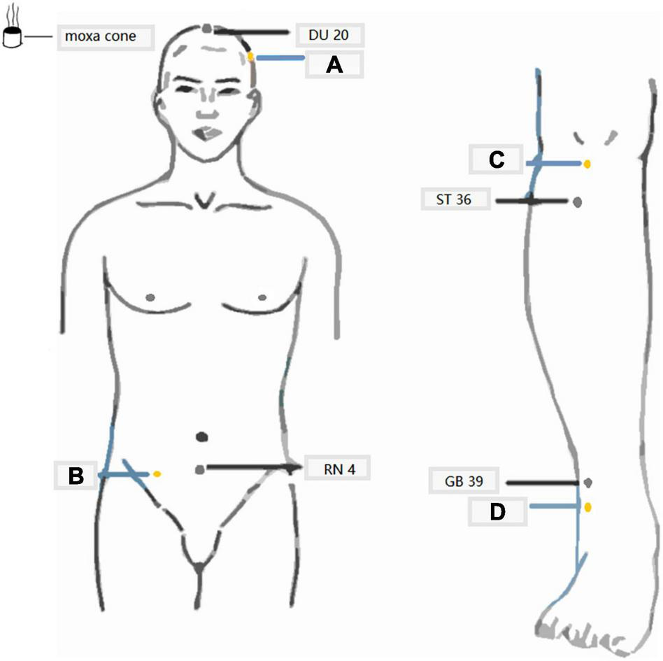 Schematic diagram of moxibustion treatment. Locations of selected acupoints and sham acupoints. The acupoints were Baihui (DU 20), Guanyuan (RN 4), Zusanli (ST 36, bilateral), and Xuanzhong (GB 39, bilateral). The sham acupoints were (A–C) (bilateral), and (D) (bilateral).