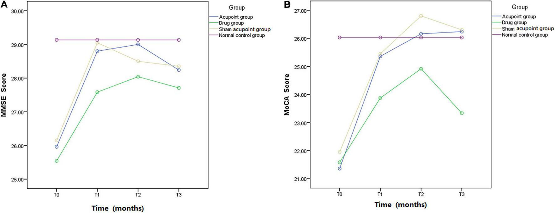 Before intervention, compared with the normal control group, the MMSE and MoCA scores, the Cho/tCr ratio in the right HIP, the NAA/tCr ratio in the bilateral HIP, and the NAA/tCr ratio in the left PCG in the three treatment groups decreased significantly (both p < 0.01), and the NAA/tCr ratio in the right PCG significantly reduced in the acupoint and drug groups (p < 0.05). After two months of treatment, compared with the normal control group, there were no differences in the MoCA scores, the NAA/tCr, and Cho/tCr ratios in the bilateral PCG and bilateral HIP in the three treatment groups (p > 0.05). However, the MMSE scores in the drug group decreased when compared with the acupoint group and normal control group (p < 0.05, p < 0.01). The scores of MMSE and MoCA in the acupoint group and sham acupoint group at all time points were better than those in the drug group, which were similar to those in the normal control group.
