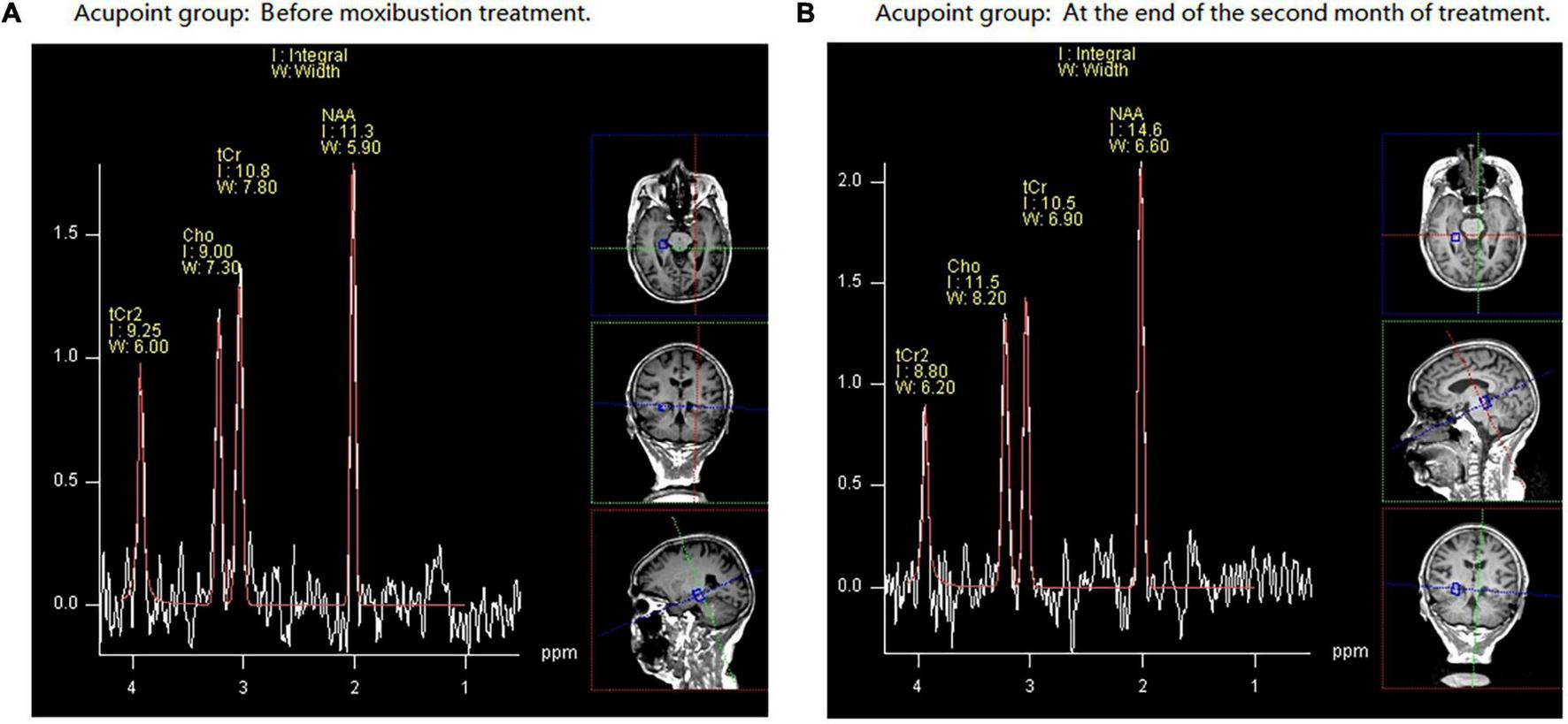 Here we used 1H-MRS to investigate the effects of moxa cone moxibustion on brain metabolisms in HIP and PCG in patients with MCI. We hypothesized that moxa cone moxibustion has a regulatory effect on the abnormal brain metabolisms in HIP and PCG.