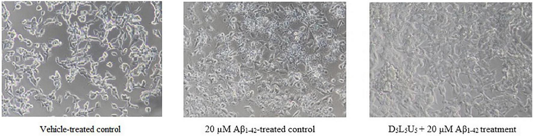 BE(2)-M17 cell morphology for vehicle-treated control, Aβ1–42-treated control and the D5L5U5 treatment. Comparison of cells for 20 μM Aβ1–42-treatment with and without D5L5U5 pre-treatment. The BE(2)-M17 cells are pre-treated with D5L5U5 followed by exposure of 20 μM Aβ1–42 for 72 h. Cell morphology was imaged using a Nikon phase-contrast microscope (X40).