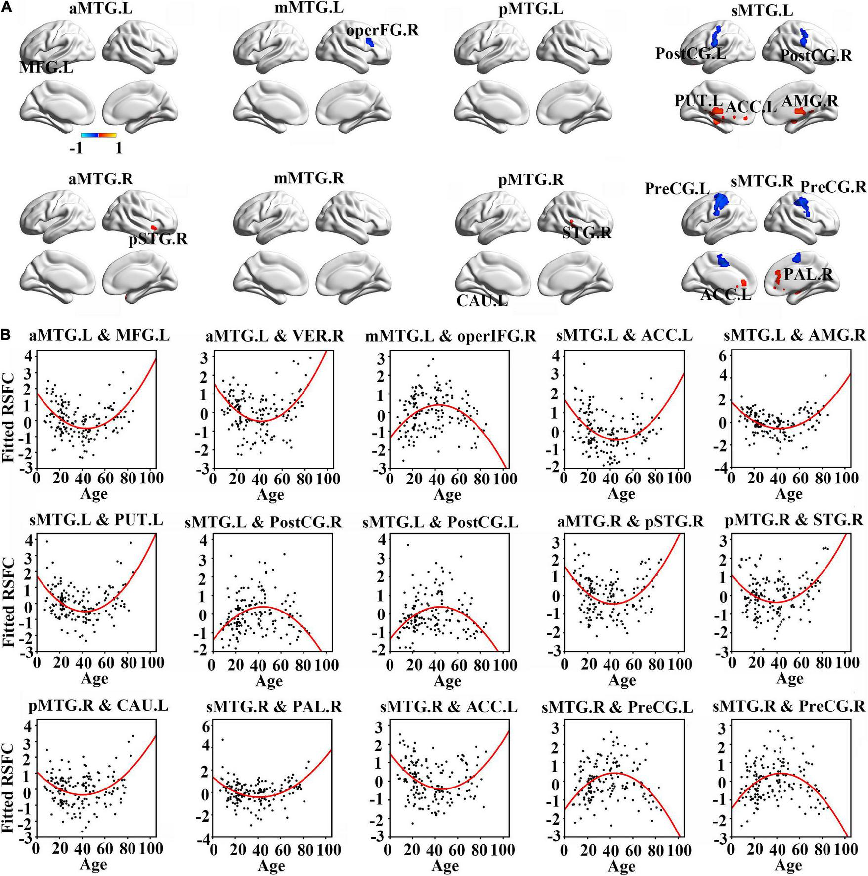 (A) Brain regions which showed a quadratic relationship between resting-state functional connectivity (RSFC) of MTG sub-regions and age across lifespan. (B) Quadratic relationships between RSFC of MTG sub-regions and age across lifespan. Abbreviations of brain regions are listed in Table 1.