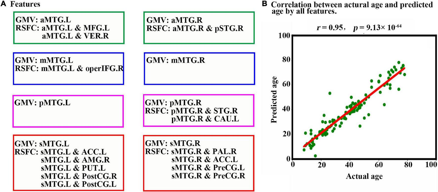 Prediction results based on features from MTG sub-regions using LSTM. (A) Features are used to predict an individual’s age in the LSTM network. The scatter plot depicts actual age versus predicted age by all features. (B) Pearson correlation analyses between the actual and predicted ages are performed to evaluate the prediction accuracy. Abbreviations of brain regions are listed in Table 1.