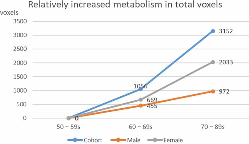 Results: Compared to the baseline group, whether in a cohort or different gender groups, the decrease of brain glucose metabolism was shown in the bilateral frontal lobe, anterior cingulate gyrus, and the bilateral temporal lobe. In males, the regions of decreased metabolism were bilateral frontal lobe, caudate nucleus, and cingulate gyrus, whereas that of females were left occipital lobe, cerebellum, and the thalamus. However, the overall decrease of brain metabolism in men and women began from the age of 60s, an aggravated decrease from 70s was only observed in males.