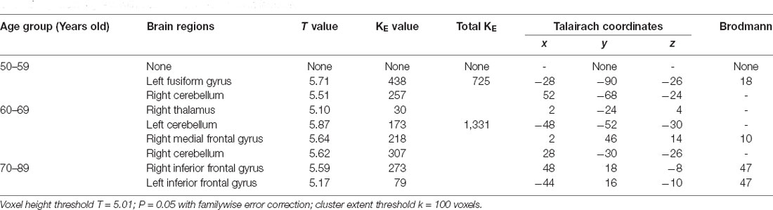 Not only decreased metabolism was observed, increased regions were also seen along with aging. An increased metabolism was found in the gray matter of the cerebellum and thalamus (Bonte et al., 2017). The results were paralleled with our results. Biswal et al. (2010) using a large sample of over 1,000 subjects have shown reduced resting-state activity in aging mainly in the default model network and increased activity in the visual, motor, and the subcortical regions. The difference from our results was probably due to the sample size and population.