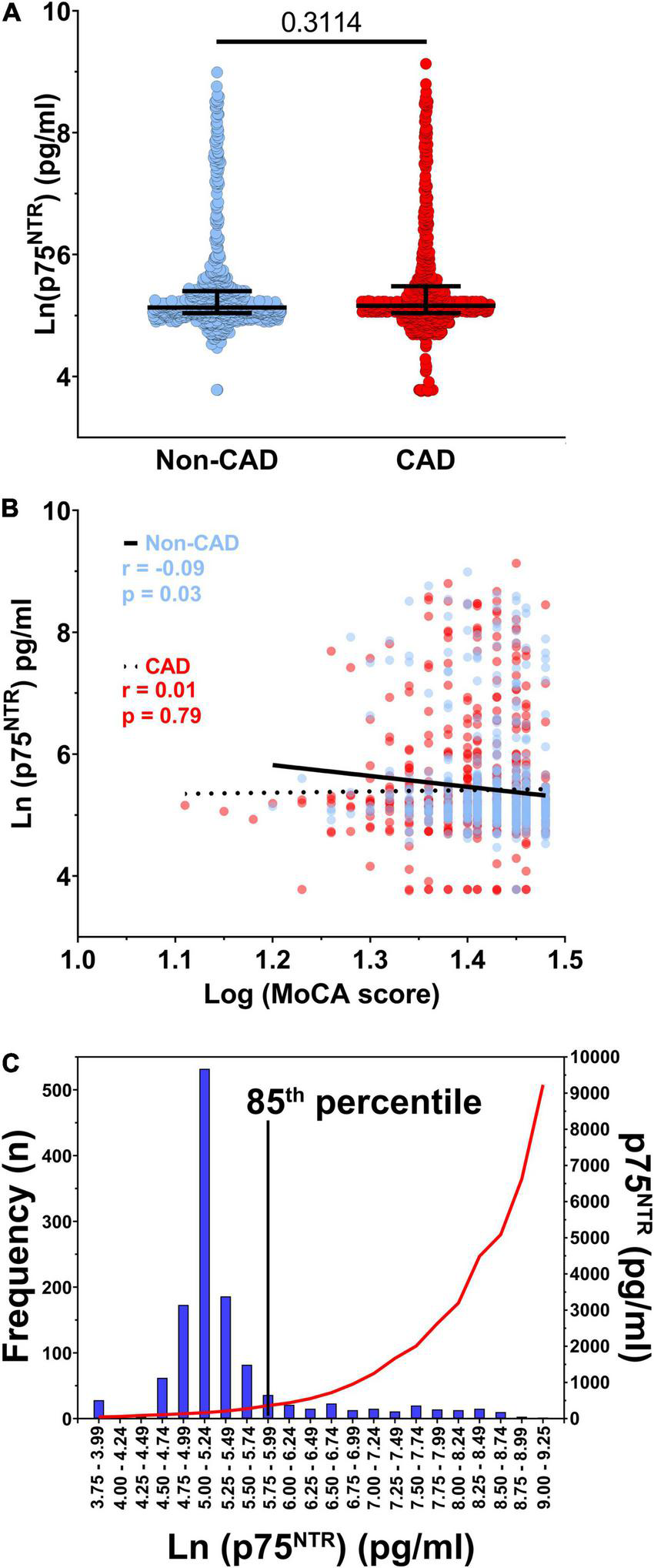 p75NTR distribution and correlation with coronary artery disease. (A) Soluble p75NTR extracellular domain (ECD) levels in participants without (blue, n = 607) and with coronary artery disease (CAD, red, n = 673). (B) Spearman correlation between The Montreal Cognitive Assessment (MoCA) score and plasma p75NTR ECD levels in non-CAD (blue, n = 607) and CAD (red, n = 673) participants. (C) Distribution of ln-transformed plasma p75NTR ECD levels (bars, left y axis) as well as the non-transformed median p75NTR plasma levels (red curve, right y axis), n = 1,280. The 85th percentile was chosen as cut-off because levels started to rise exponentially around this percentile.