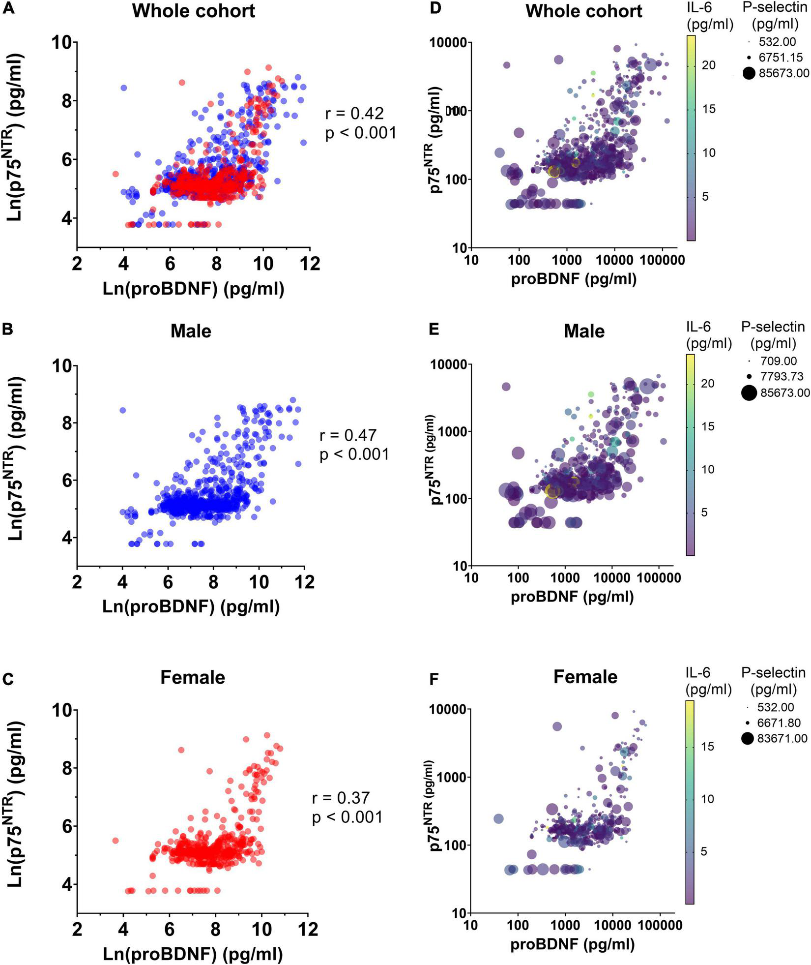 Univariate analyses using ln-transformed p75NTR ECD levels as a continuous variable identified p75NTR ligand proBDNF, thrombo-inflammatory molecules IL-6 and CD40L, and male sex as positively associated with the p75NTR ECD levels in plasma (Table 2). In multivariate linear regression, proBDNF, IL-6, CD40L, male sex, age, P-selectin (a marker of platelet activity), and glucose levels were significantly associated with p75NTR (Table 2). Overall, this multivariate model explained 35.5% of p75NTR ECD level variation (p < 0.0001).