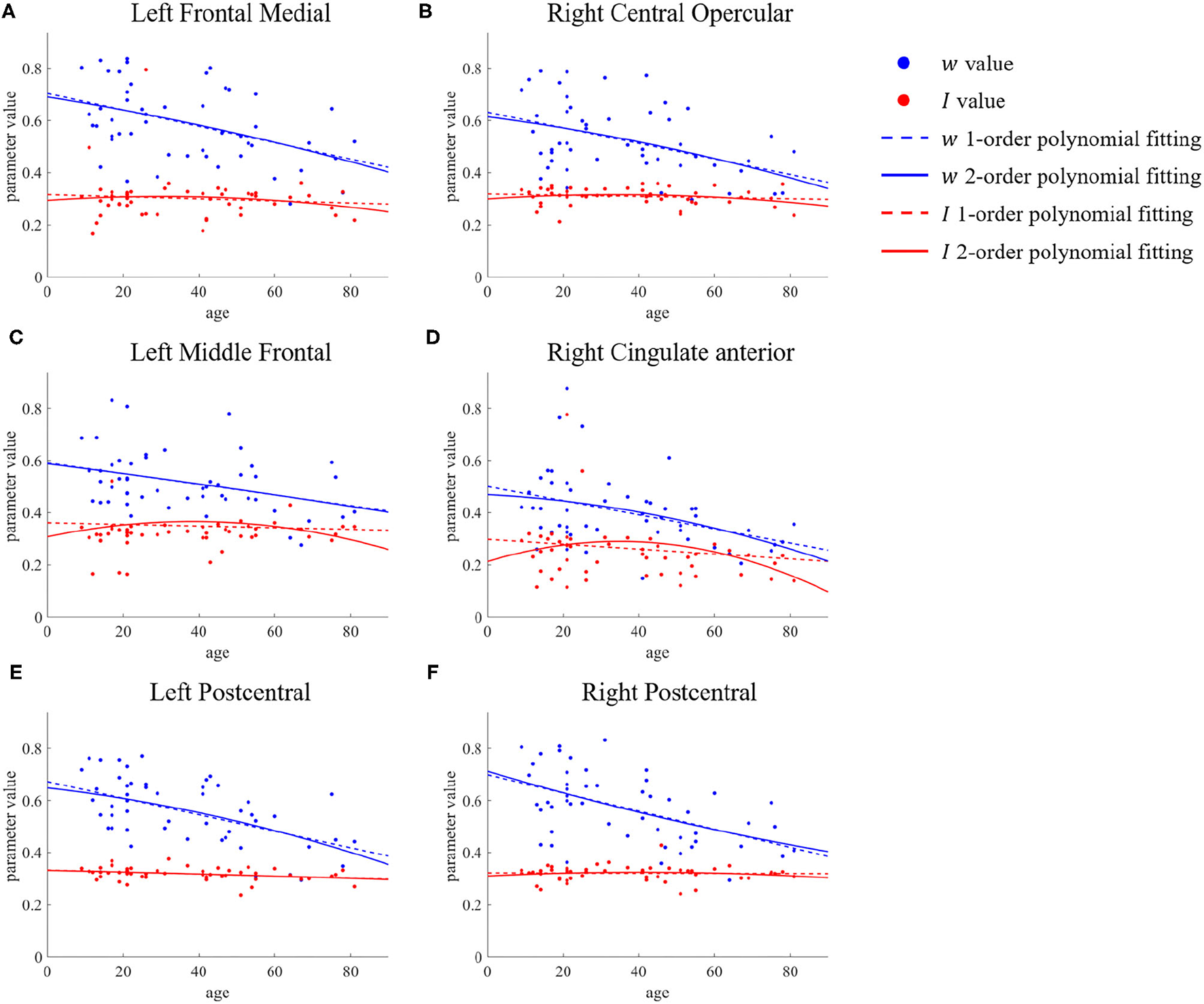 ROIs with no significant difference in first- and second-order polynomial fits of recurrent connection strength w. The points represents the parameter values, the dashed lines are the first-order polynomial fits, and the solid lines are the second-order polynomial fits. Blue indicates w and red indicates I. (A) Left Frontal Medial. (B) Right Central Opercular. (C) Left Middle Frontal. (D) Right Cingulate anterior. (E,F) Bilateral Postcentral.