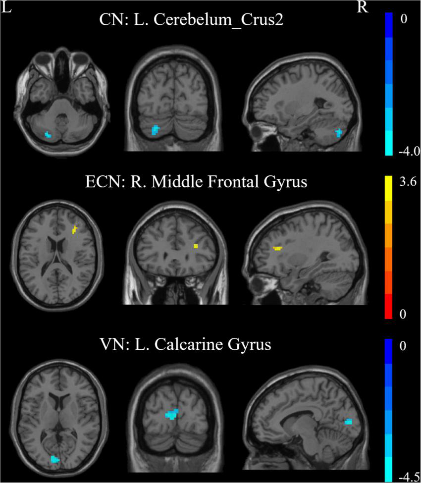 Intra-network connectivity differences within RSNs in the patients vs. controls. CN, cerebellum network; ECN, executive control network; VN, visual network; R, Right; L, Left.