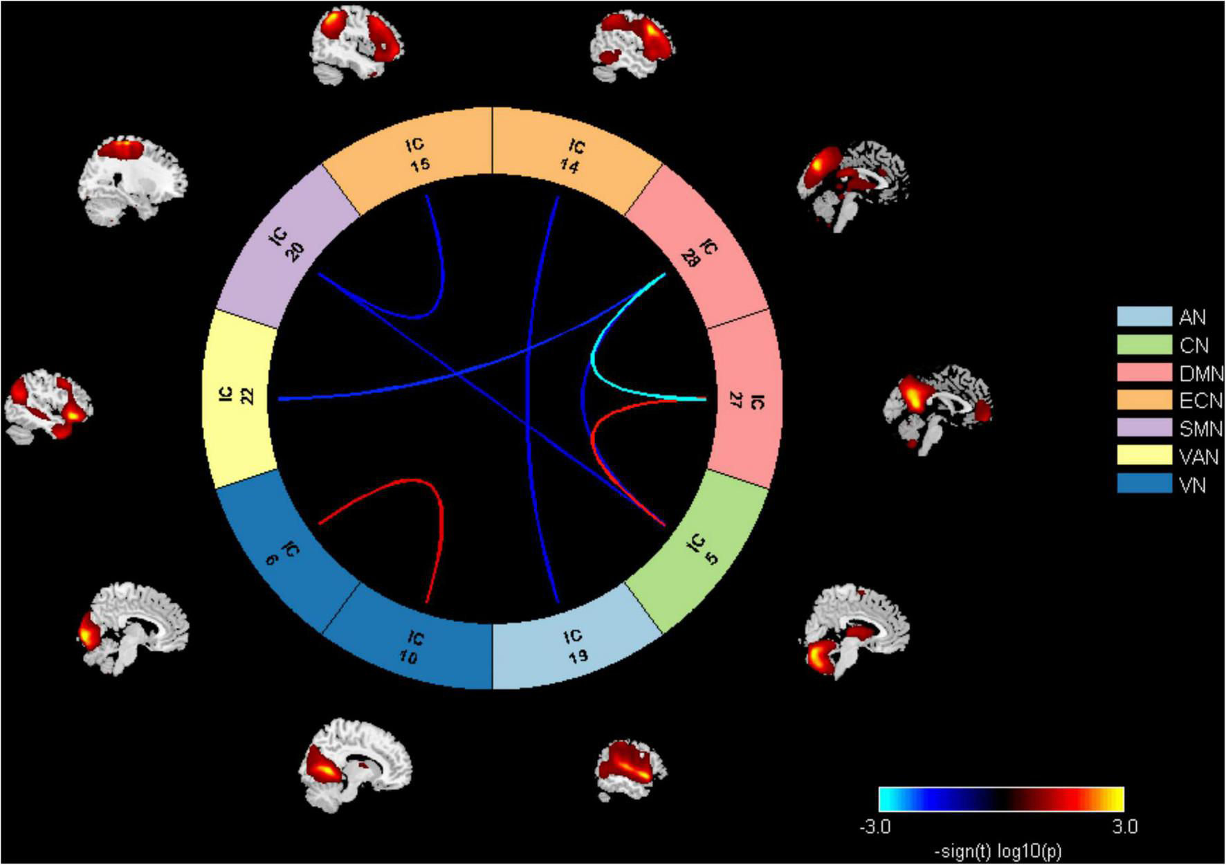 Inter-network connectivity differences between groups. AN, auditory network; CN, cerebellum network; DMN, default mode network; ECN, executive control network; SMN, sensorimotor network; VAN, ventral attention network; VN, visual network.