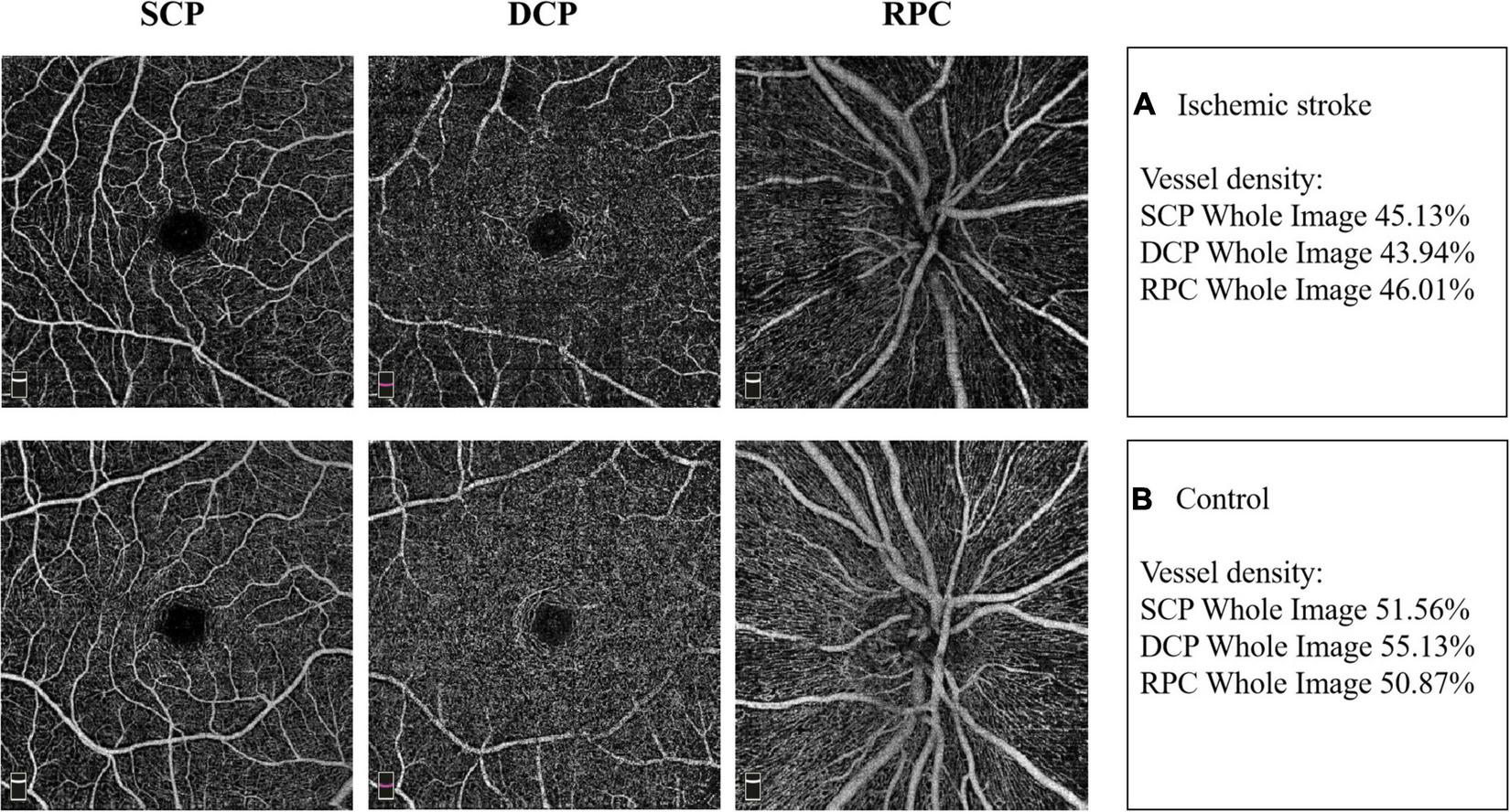 Example images of retinal vascular density in the two groups. (A) The retinal vessel density in superficial capillary plexus (SCP), deep capillary plexus (DCP) and radial peripapillary capillaries (RPC) in IS patient. (B) The retinal vessel density in SCP, DCP and RPC in non-stroke subject.