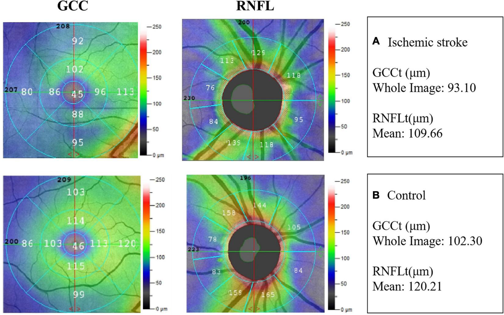 Example images of retinal neural thickness in the two groups. (A) The ganglion cell complex thickness (GCCt) and retinal nerve fibre layer thickness (RNFLt) in IS patient. (B) The GCCt and RNFLt in non-stroke subject.