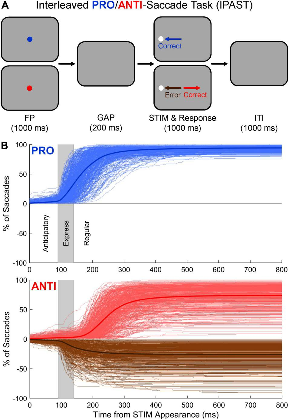 Experimental manipulations of the PRO and ANTI tasks produce distinct changes in SRT and direction error rate. In the gap condition, removal of the central fixation point 200 ms before stimulus appearance elicits increased rates of “express saccades,” reflexive, short-latency saccades that approach the minimum sensory-motor conduction delays in the brain (Fischer and Boch, 1983; Fischer and Ramsperger, 1984; Paré and Munoz, 1996). Other manipulations, such as increasing the temporal and spatial predictability of stimulus appearance, have also been shown to increase the frequency of these short-latency saccades (Dorris and Munoz, 1998; Bibi and Edelman, 2009; Marino and Munoz, 2009). In the interleaved PRO/ANTI task (IPAST), PRO and ANTI trials are randomly interleaved within a block, with trial condition indicated by the color of the central fixation point. The IPAST requires continuous updating of the saccade goal from trial to trial, producing longer SRTs and increased direction error rates, relative to blocked tasks (Cherkasova et al., 2002; Reuter et al., 2006). The IPAST with gap is therefore highly effective at eliciting correct responses and direction errors made at both express and longer (often referred to as “regular”) latencies. The SRT distribution for PRO trials in this task consists of both express- and regular-latency correct responses, while the SRT distribution for ANTI trials in this task consists of express- and regular-latency direction errors, as well as regular-latency correct responses (Munoz and Everling, 2004; Coe and Munoz, 2017).