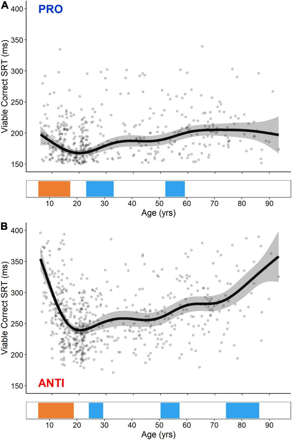 GAM fits and significant periods of change for PRO (A) and ANTI (B) viable correct SRT. Scatter points are individual participants, black curves are the GAM fits, and gray ribbons are the 95% confidence intervals. Bottom tiles indicate significant periods of developmental-related (orange) and aging-related (blue) change.