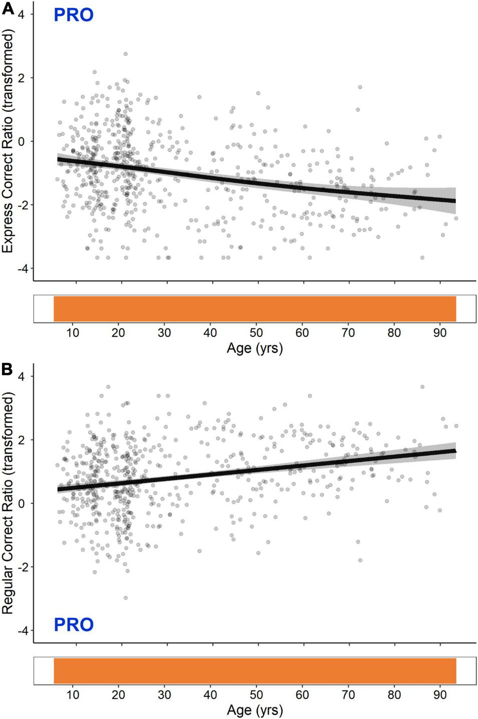GAM fits and significant periods of change for PRO express- and regular-latency correct response ratios are shown in Figure 4. These two measures exhibited opposing linear trends that were significant across the entire lifespan; PRO express-latency correct responses decreased continuously from the ages of 5–93, whereas PRO regular-latency correct responses increased continuously from the ages of 5–93.
